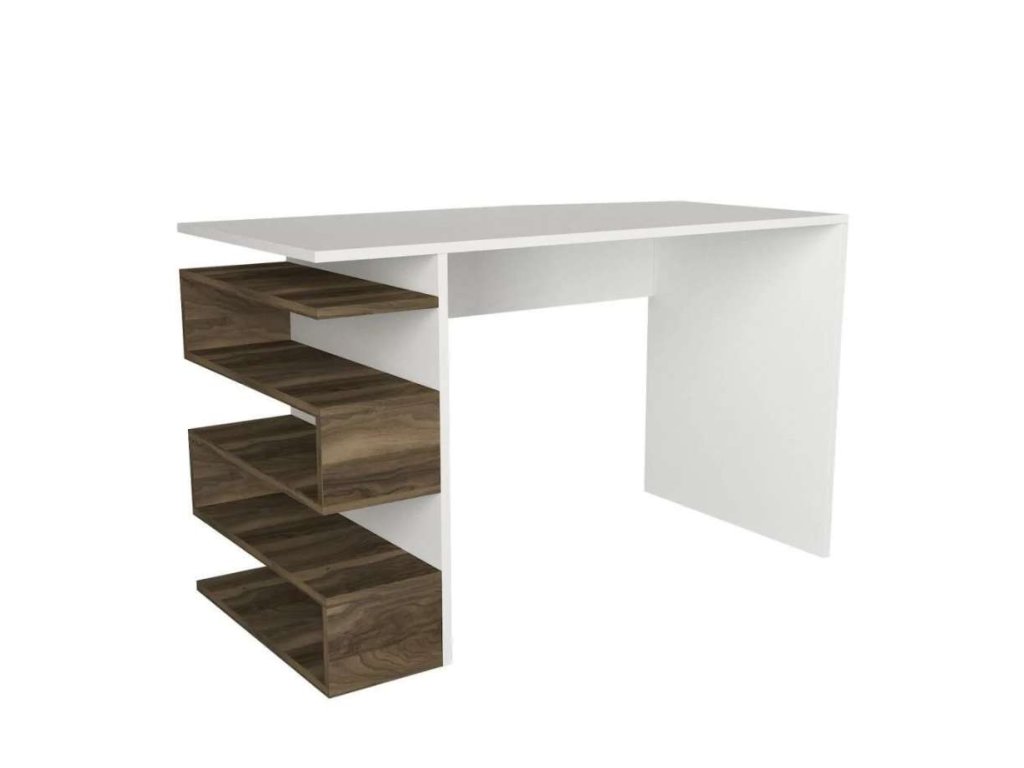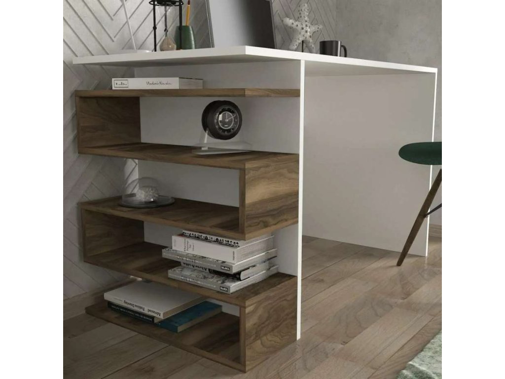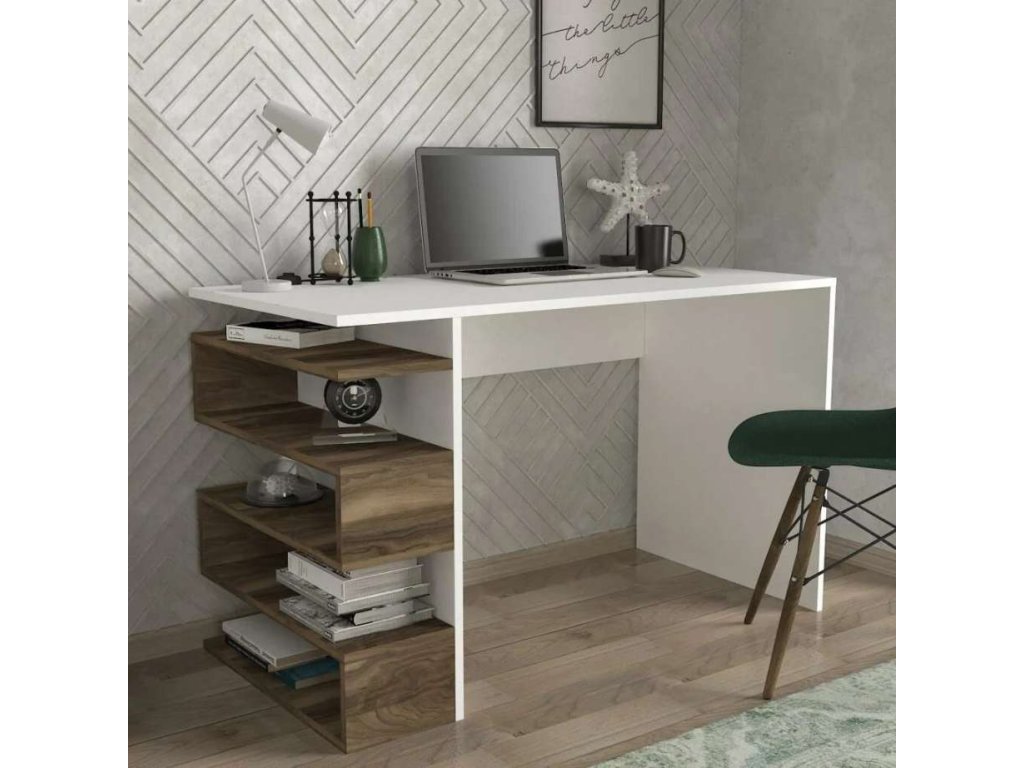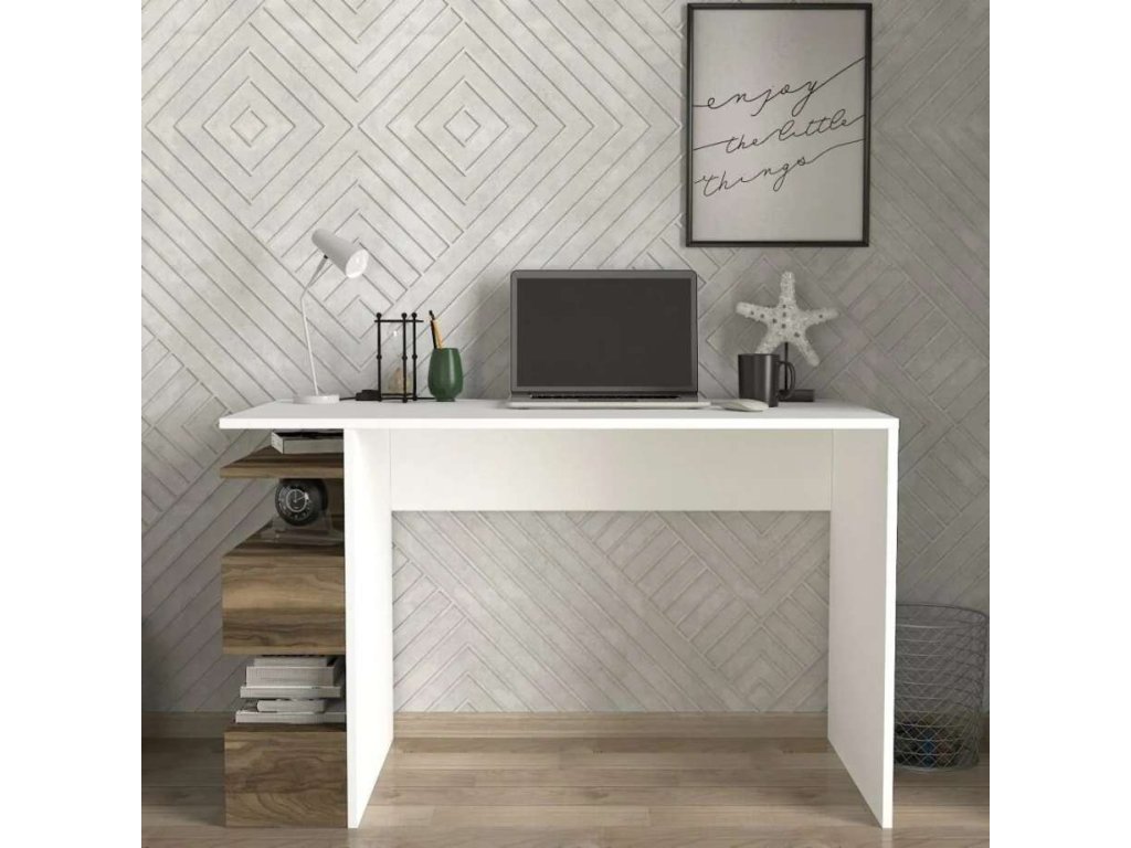 Písací stůl je vyroben z kvalitního LTD materiálu s tloušťkou 18 mm, což zajišťuje jeho pevnost a dlouhou životnost. Elegantní kombinace bílé barvy a ořechového dekoru dodává stolu moderní a sofistikovaný vzhled, který se hodí do jakéhokoliv interiéru. Stůl je vybaven praktickým regálkem, který poskytuje dostatek úložného prostoru pro vaše pracovní potřeby a pomůcky.
