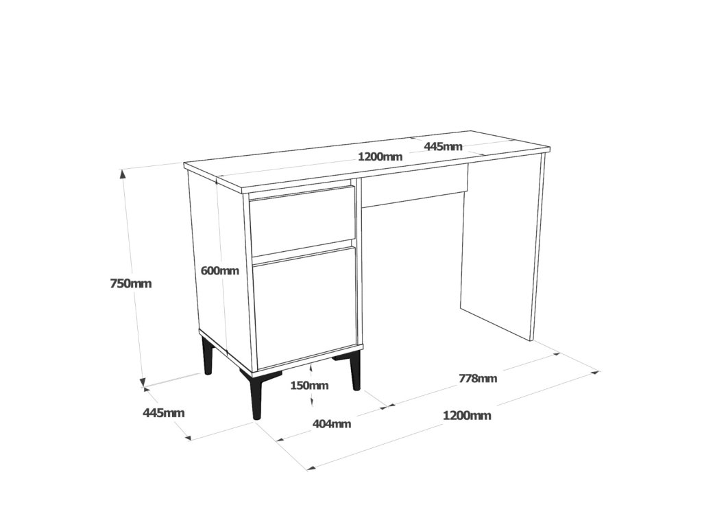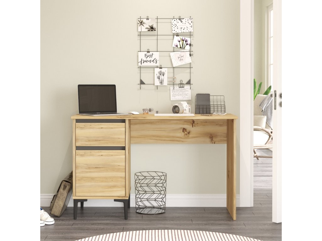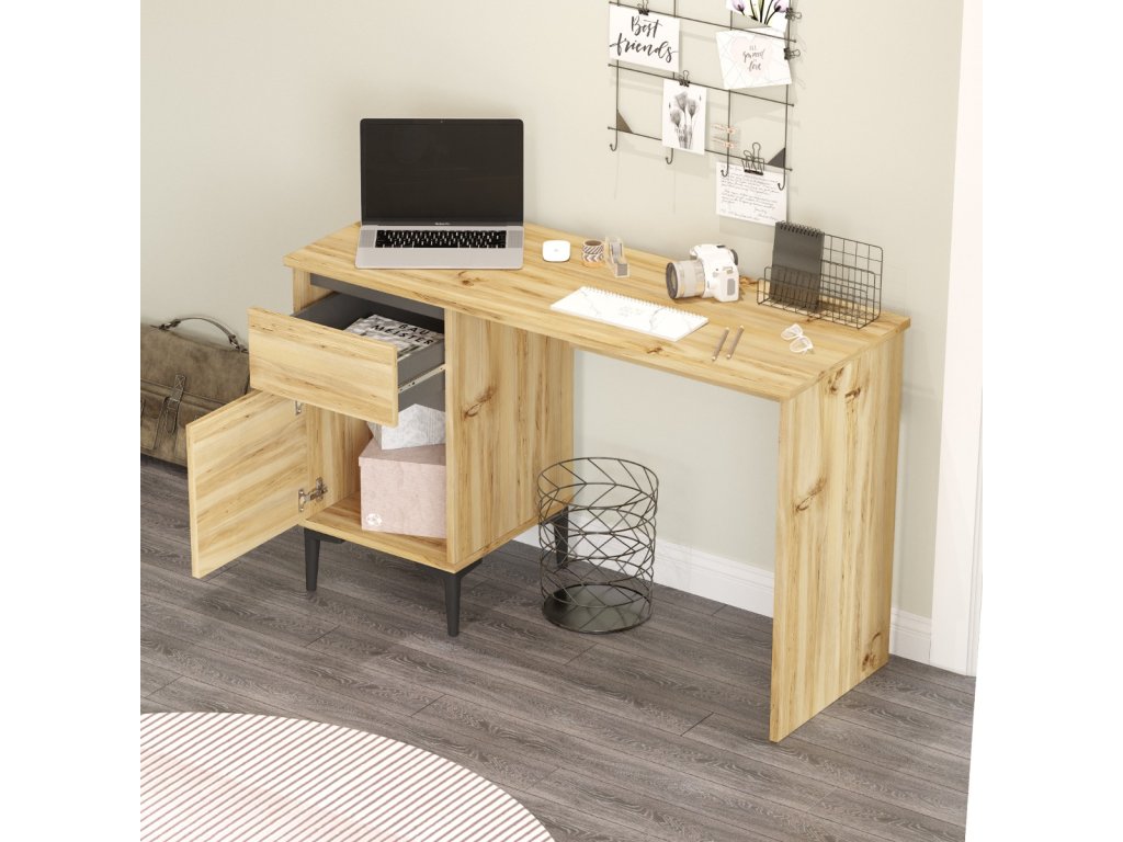 - Vybavení: Stůl je vybaven praktickou zásuvkou pro vaše potřeby a skříňkou s plnými dvířky pro uložení různých materiálů a dokumentů.