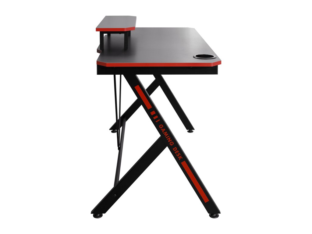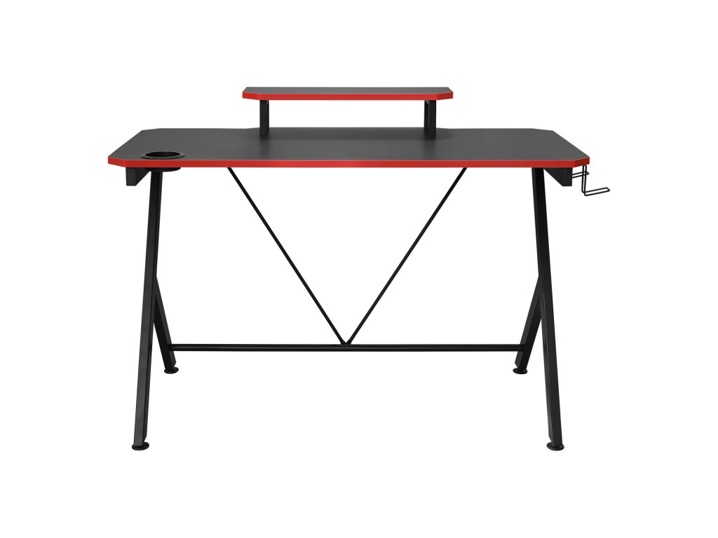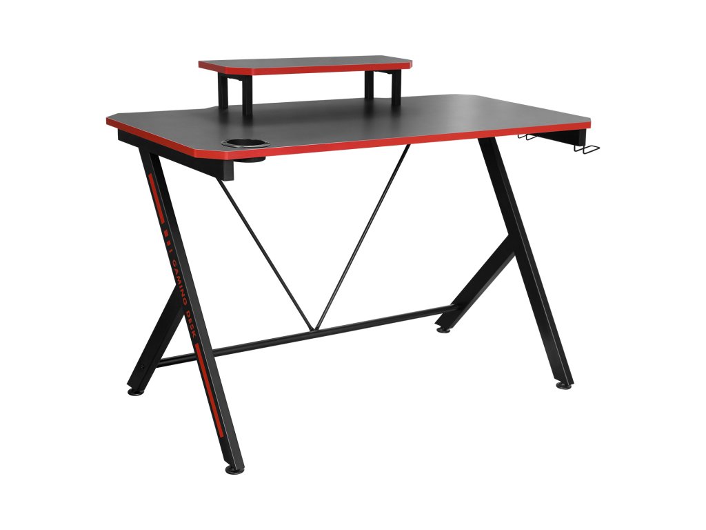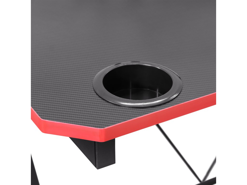 barevné provedení černá / červená kovová konstrukce, horní desky ve vzhledu materiálu z karbonových vláken police na monitor, držák na nápoje, dva háčky na příslušenství zadní hrana stolu vykrojená na protažení kabelůDoplňkové parametry