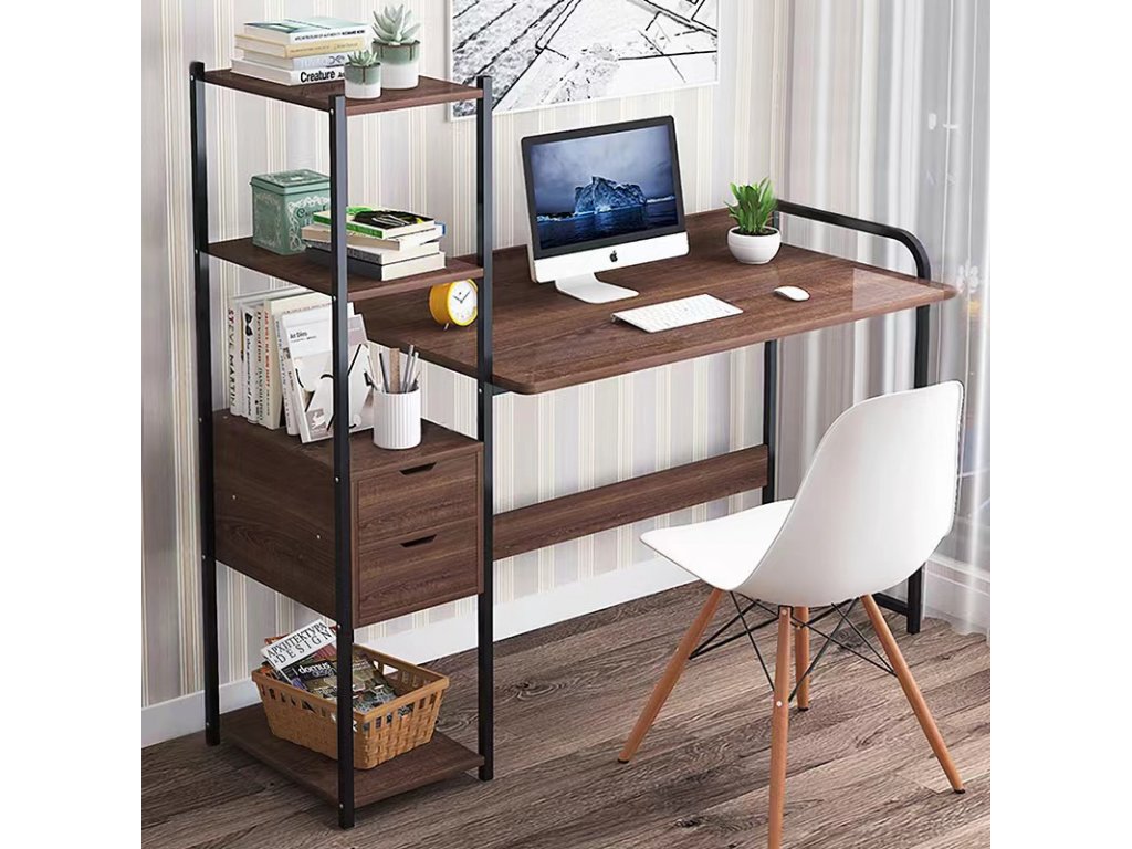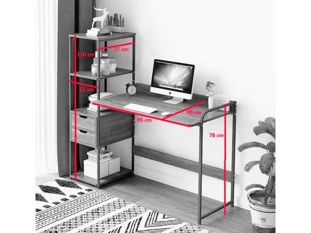 Elegantní psací stůl do pracovny, kanceláře i studentského pokoje s praktickým regálem a dvěma šuplíky. Stůl nabízí kvalitní zpracování v podobě pevné ocelové konstrukce černé barvy. Deska stolu a police jsou vyrobeny z MDF desky v barvě ořech. Rozměry viz obrázek. Dodáváme v demontovaném stavu.Doplňkové parametry