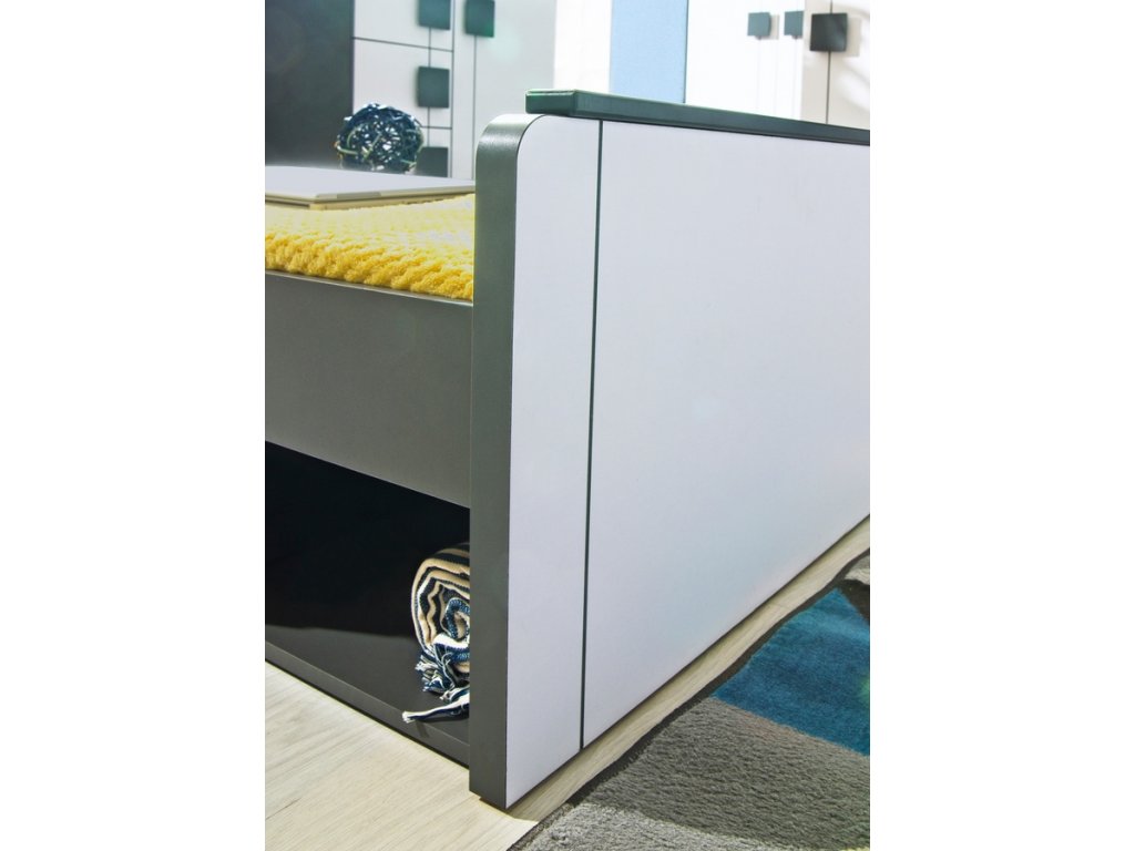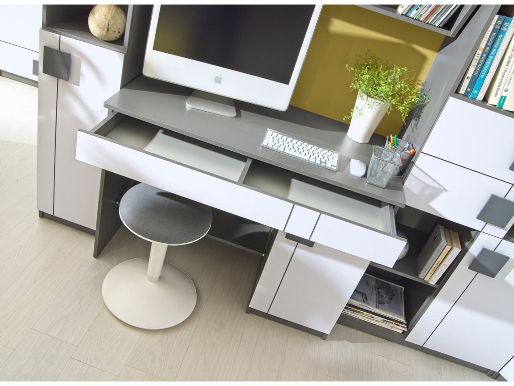 Pracovní rohový stůl Gumi je vyroben především do dětských pokojů a studentských prostorů. Nábytek z kolekce GUMI je navržen v moderním stylu v provedení dekoru v kombinaci antracitové a brilantní bílé barvy. PC stolek obsahuje praktickou výsuvnou desku na klávesnici.