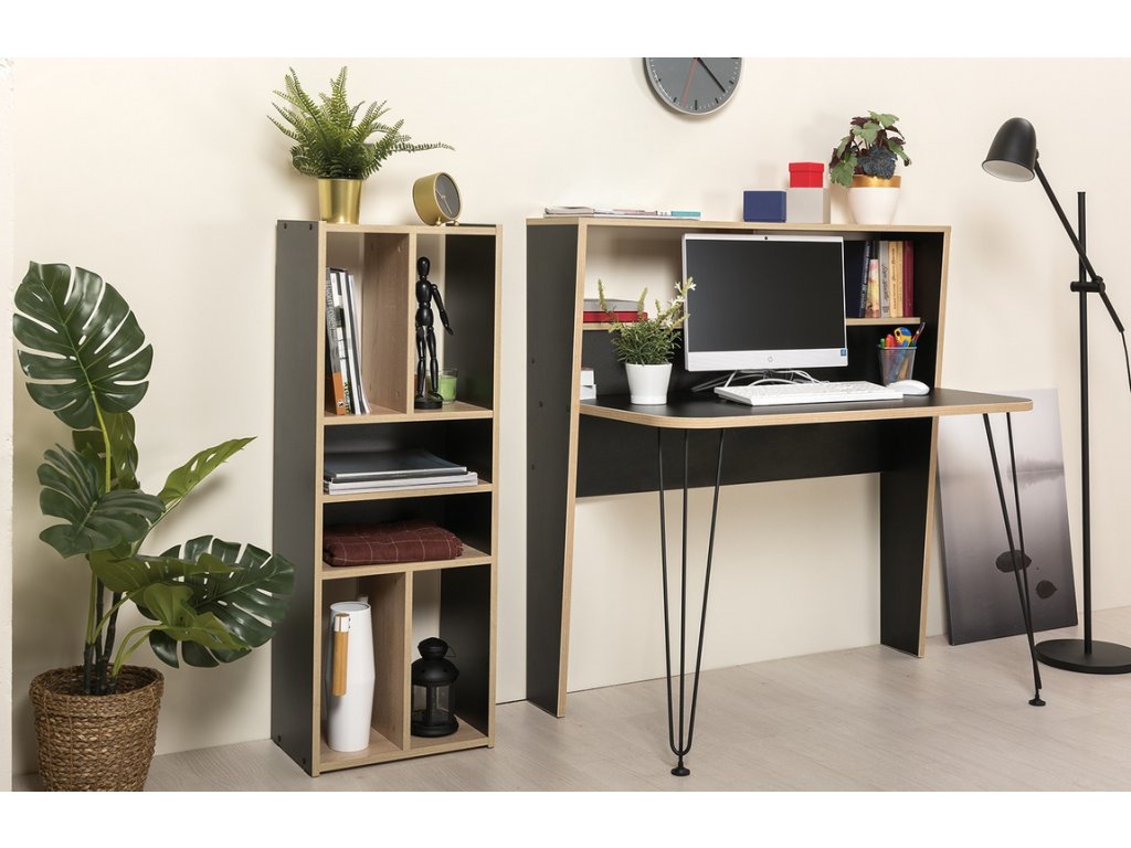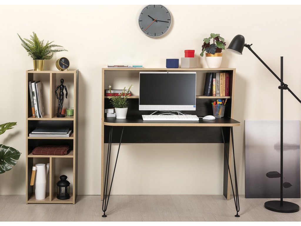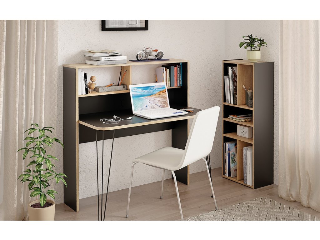 Pracovní stůl s integrovanou policí je vyroben z desky LTD v barevném provedení černá/dub sonoma. Přední nohy stolu jsou kovové. Dodáváme v demontovaném stavu. DOPRODEJ!Doplňkové parametry