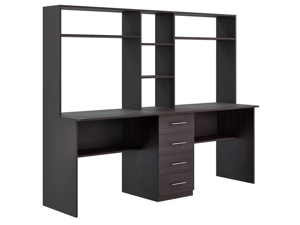 Praktický pracovní stůl se dvěma pracovními plochami a policovým nástavcem je vyroben z LTD desky odolné vůči poškrábání v barvě wenge. Stůl je uprostřed rozdělen čtyřmi zásuvkami. Výška stolu včetně nástavce je 152 cm, hloubka nástavce je 30 cm. Výška pracovní plochy je 76,5 cm. Dodáváme v demontovaném stavu.Doplňkové parametry