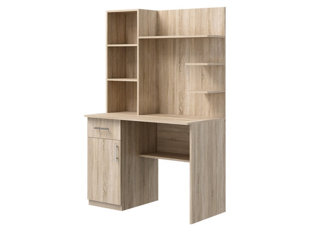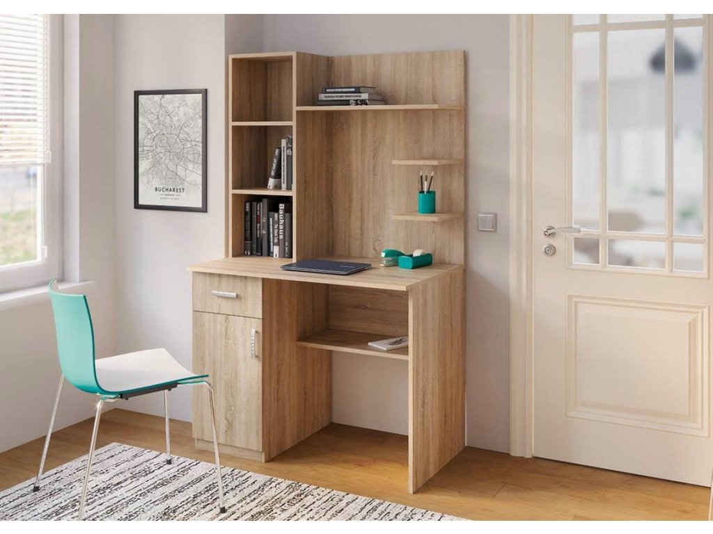 Praktický pracovní stůl s policovým nástavcem je vyroben z LTD desky odolné vůči poškrábání v barvě dub sonoma. Stůl má na levé straně skříňku a nad ní zásuvku. Výška stolu včetně nástavce je 166,5 cm, hloubka nástavce je 30 cm. Výška pracovní plochy je 76,5 cm. Dodáváme v demontovaném stavu.Doplňkové parametry
