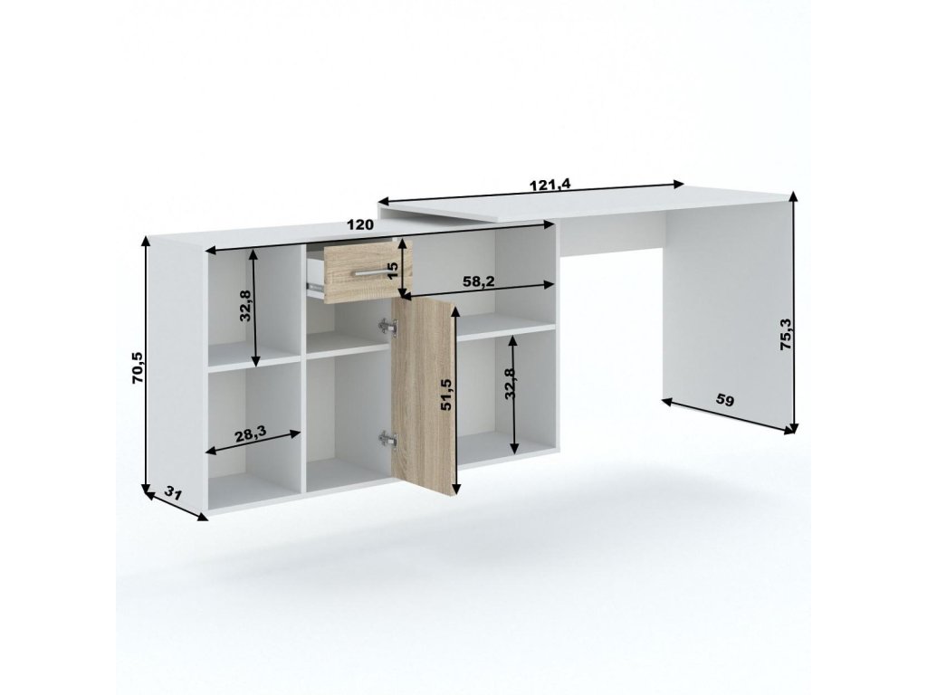 Pracovní stůl skládací nejen do rohu je vyroben z desky LTD v barevném provedení na výběr. Praktičnost stolu spočívá v jeho rozložení podle vašich představ. Obsahuje dvířka, zásuvku a spoustu úložného prostoru. Stůl je možné složit na pravou i levou stranu. Dodáváme v demontovaném stavu.Doplňkové parametry