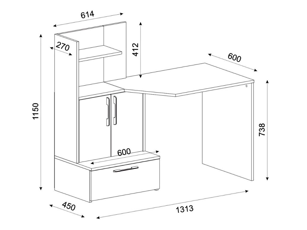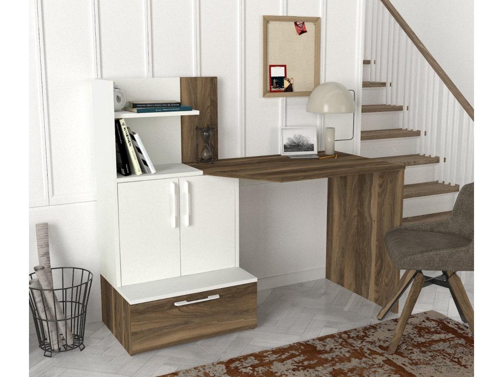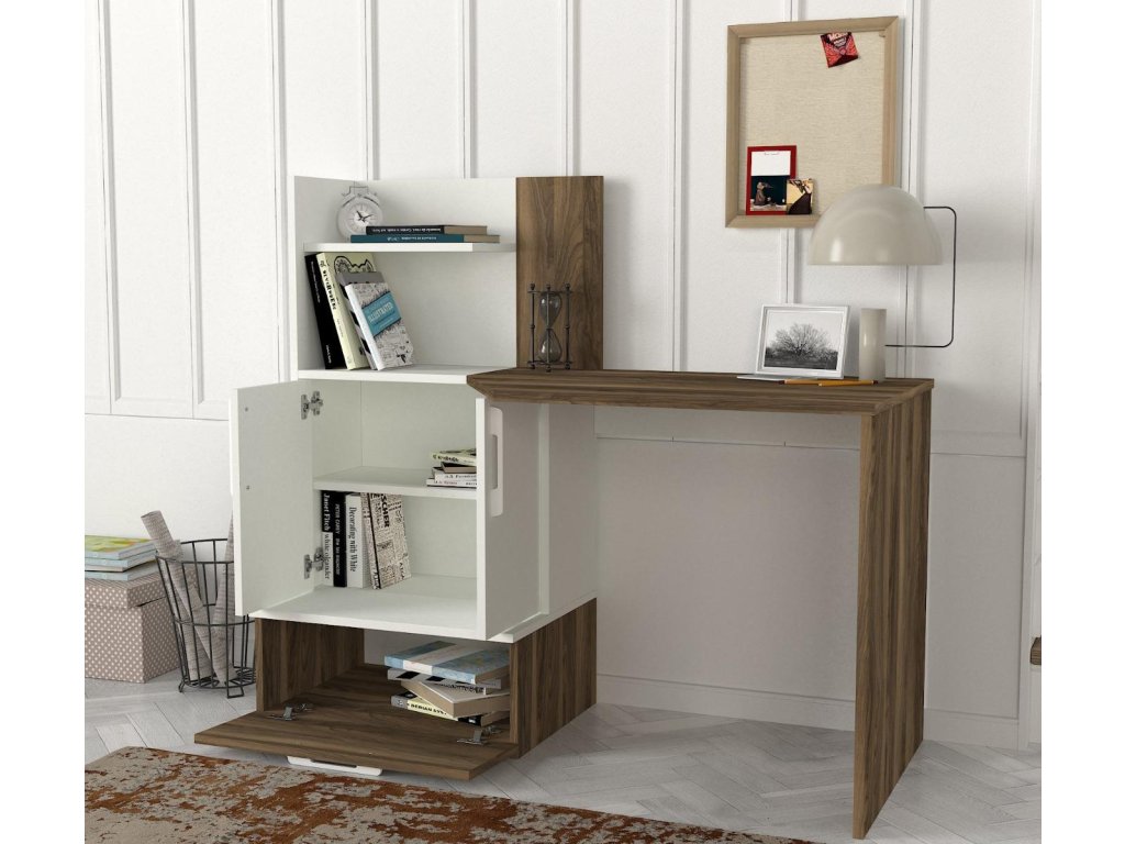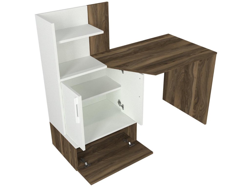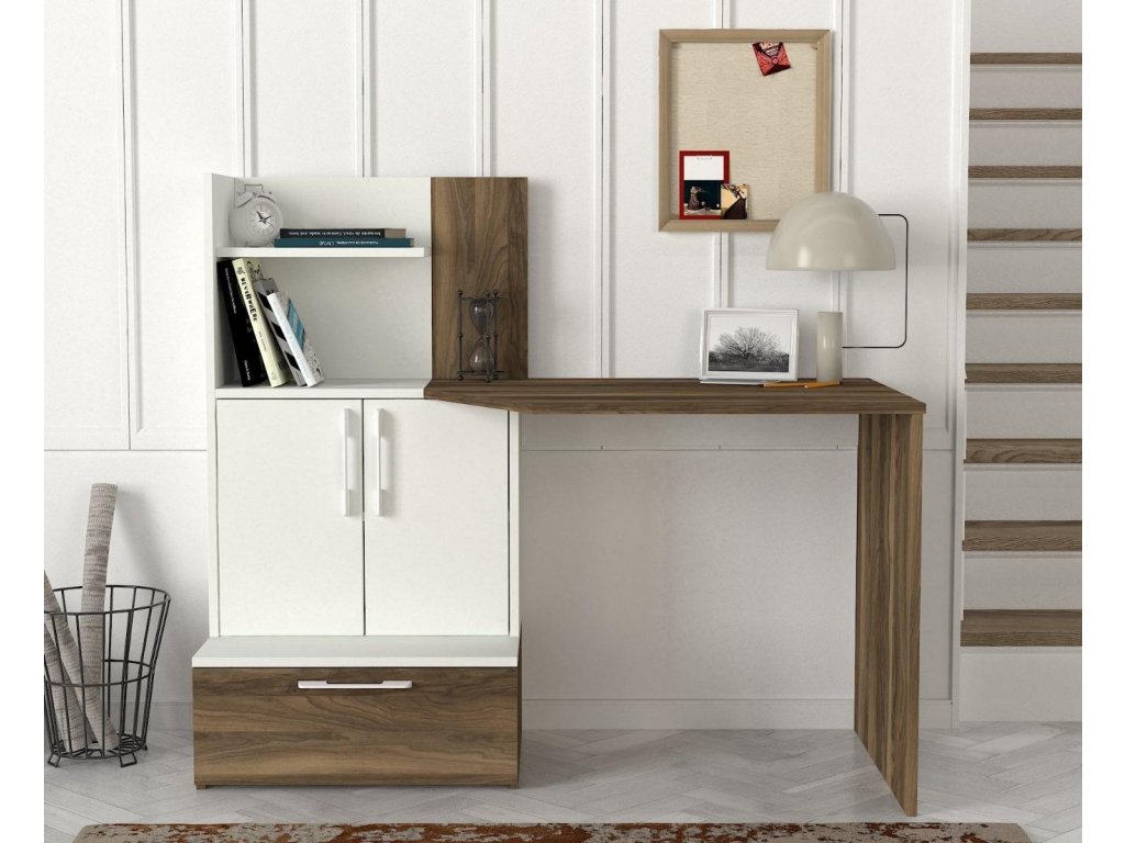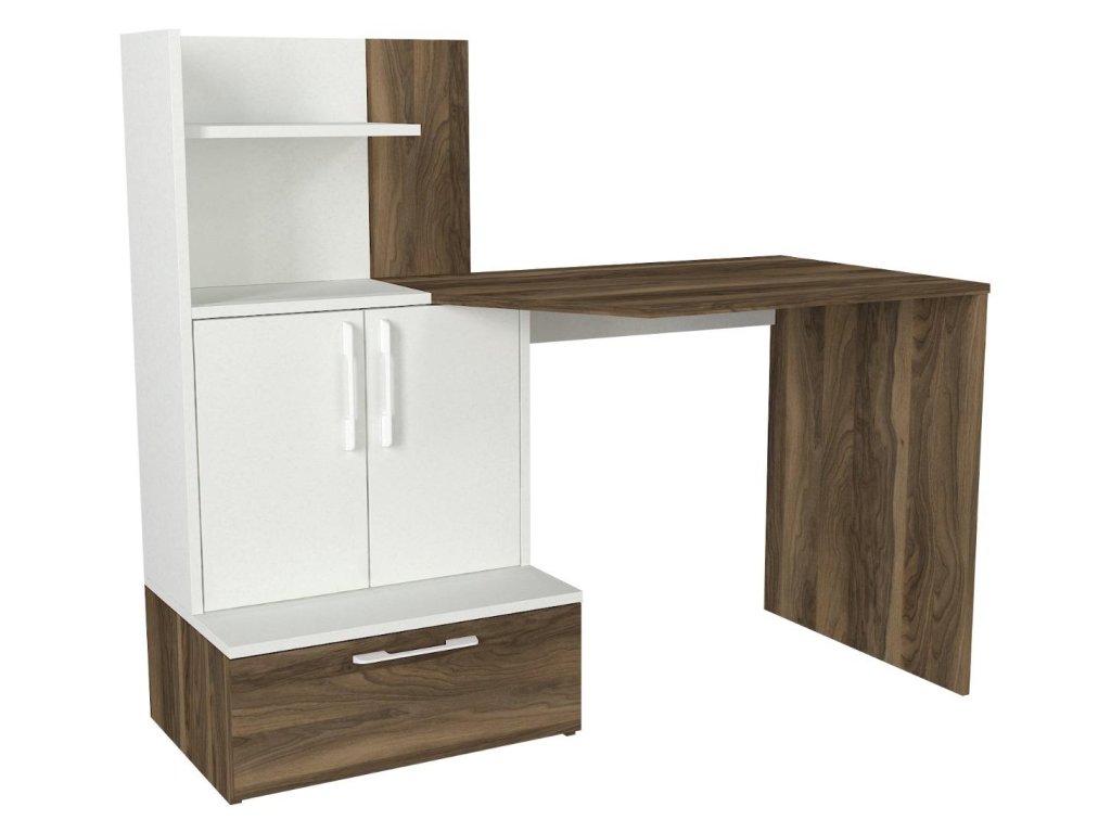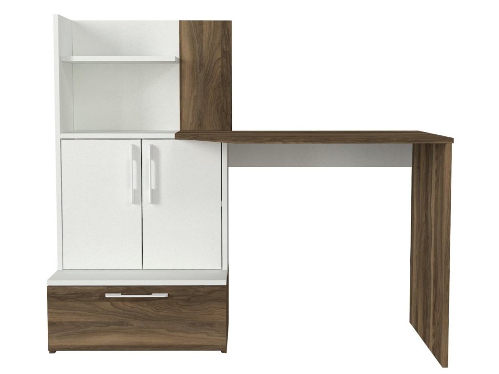 Pracovní stůl s policovým regálem a 2 skříňkami je vyroben z kvalitního lamina o tl.18 mm hraněné PVC páskou, odolného proti poškrábání v barvě ořech vlašský/matná bílá. Disponuje úložným prostorem s dvířky a také dvířky s výklopem ve spodní části. Výška pracovní desky je 73,8 cm. Dodáváme v demontovaném stavu.Doplňkové parametry
