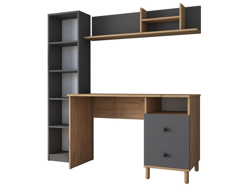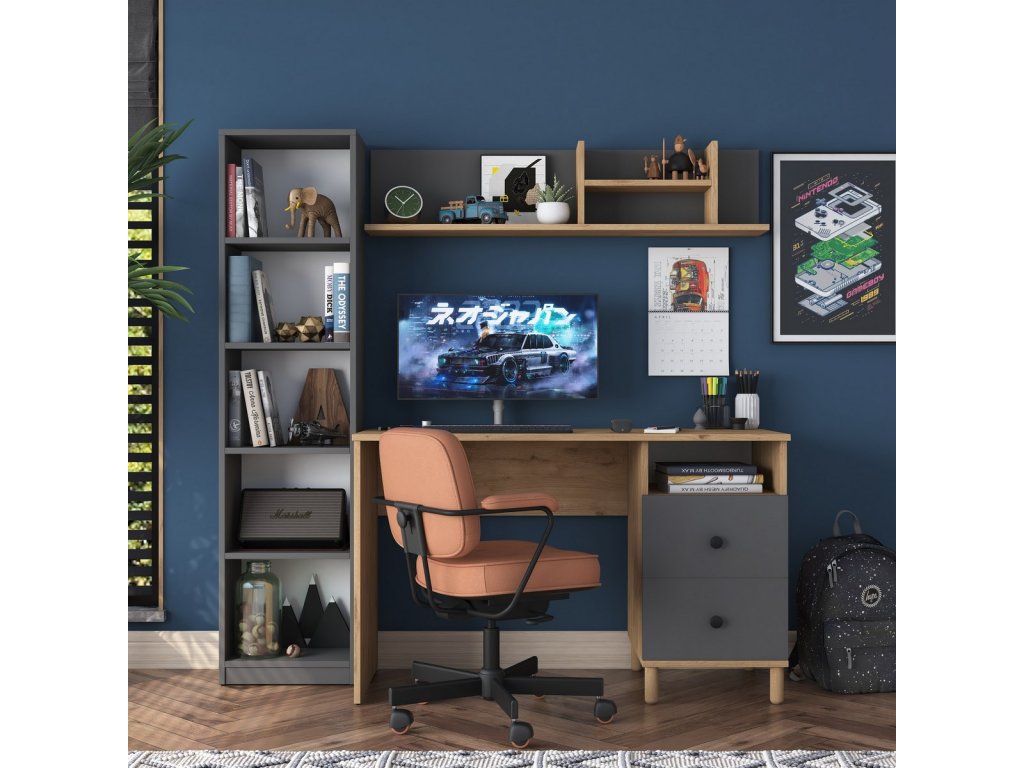 Moderní pracovní stůl navržený pro efektivní práci i studium. Tento elegantní stůl je ideální pro dětský pokoj nebo kancelář či pracovnu, čímž přináší do každého interiéru stylový a čistý vzhled. Materiál je Melamin, VT laminát (18 mm). Barevné provedení je ořech/antracit. Stůl nabízí 6 polic a 2 zásuvky pro praktické úložné místo. Kvalitní melaminový povrch zajišťuje snadnou údržbu a dlouhou životnost. Dodáváme v demontovaném stavu.