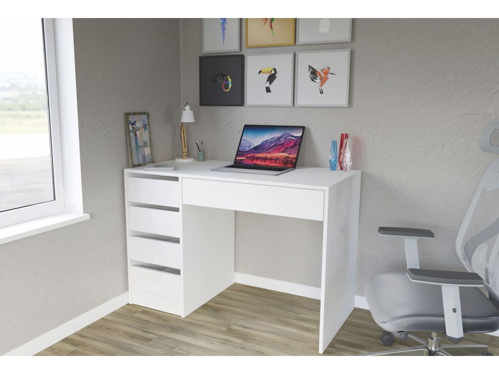 Elegantní pracovní stůl. Je mimořádně praktický díky pěti zásuvkám na teleskopických kolejnicích. je vyrobený z kvalitní laminátové desky v barevném provedení matná bílá (nymphea alba). Jde o levou variantu, lze zakoupit i opačnou verzi. Dodáváme v demontovaném stavu.Doplňkové parametry