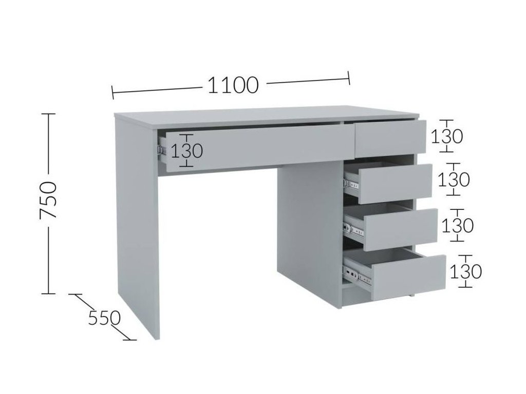 Elegantní pracovní stůl. Je mimořádně praktický díky pěti zásuvkám na teleskopických kolejnicích. je vyrobený z kvalitní laminátové desky v barevném provedení činčila grey. Jde o levou variantu, lze zakoupit i opačnou verzi. Dodáváme v demontovaném stavu.Doplňkové parametry