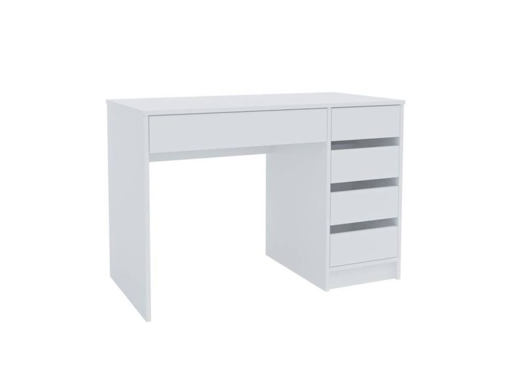 Elegantní pracovní stůl. Je mimořádně praktický díky pěti zásuvkám na teleskopických kolejnicích. je vyrobený z kvalitní laminátové desky v barevném provedení matná bílá (nymphea alba). Jde o pravou variantu, lze zakoupit i opačnou verzi. Dodáváme v demontovaném stavu.Doplňkové parametry