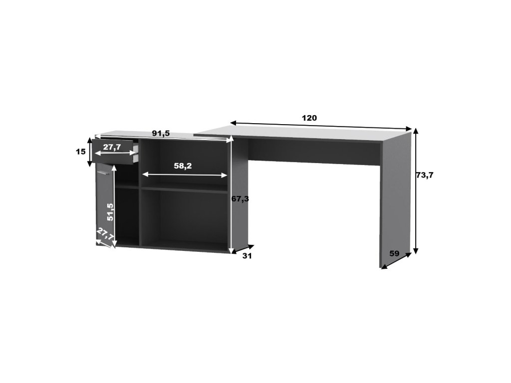 Psací stůl se spoustou úložného prostoru v moderním stylu, je vyroben z kvalitní LTD desky v barevném provedení grafit. Výhodu tohoto stolu je jeho možnost sestavení rovně nebo do pravého úhlu. Úchyty jsou v barvě stříbrné. Dodáváme v demontovaném stavu.Doplňkové parametry