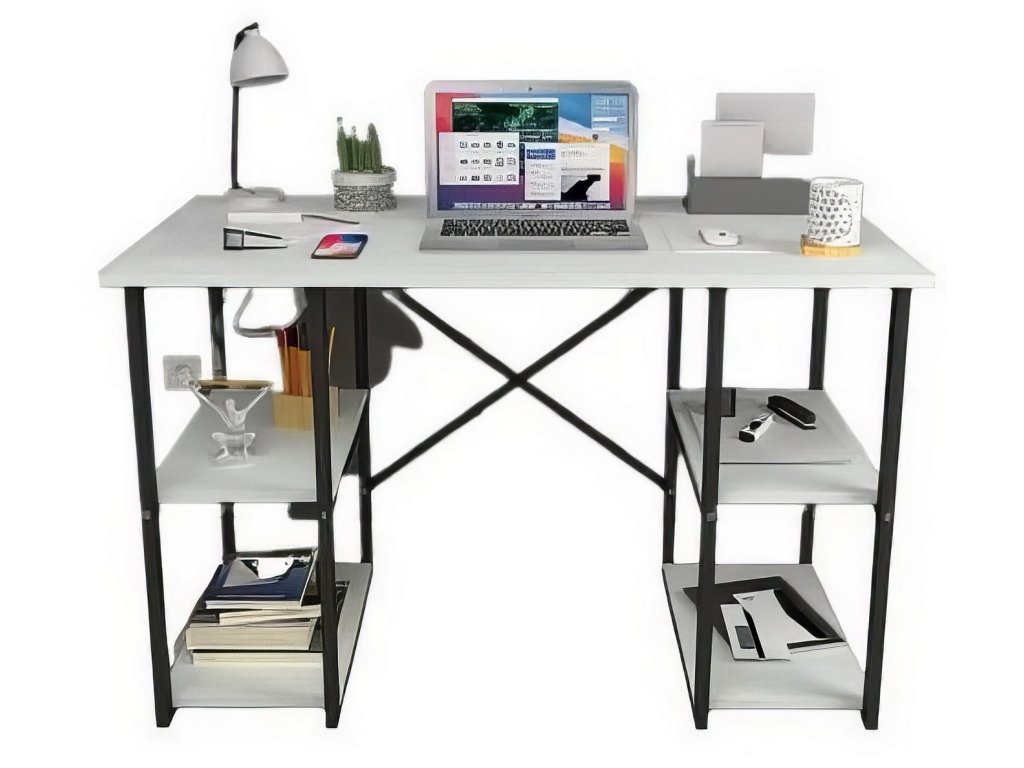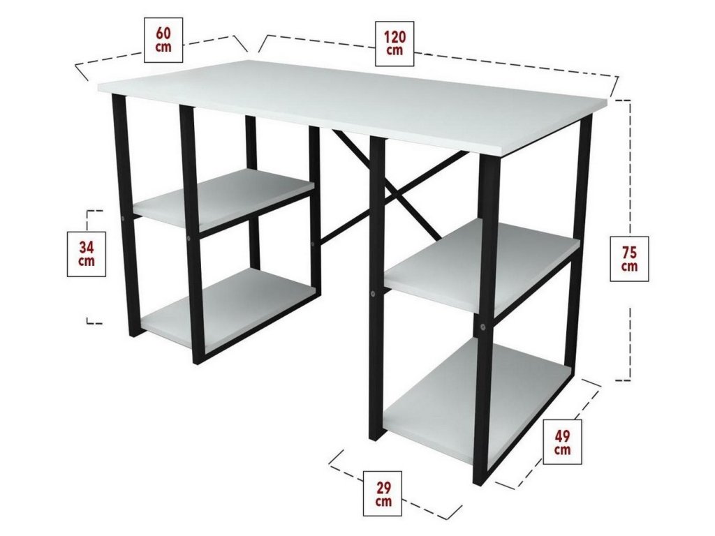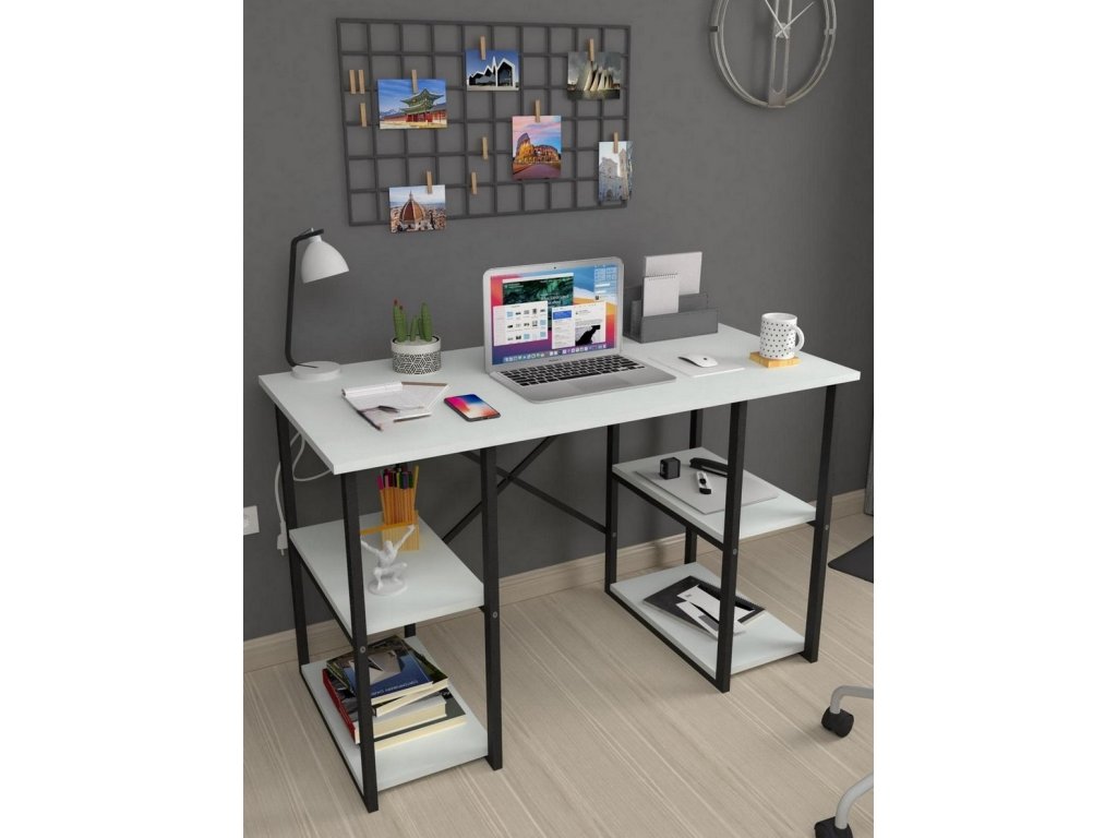 Psací stůl s praktickými policemi po stranách je vyroben z kvalitní desky LTD nenáročné na údržbu, v barevném provedení bílá. Tloušťka materiálu - 18 mm. Konstrukce je vyrobena z kovu v černé barvě. Dodáváme v demontovaném stavu.Doplňkové parametry