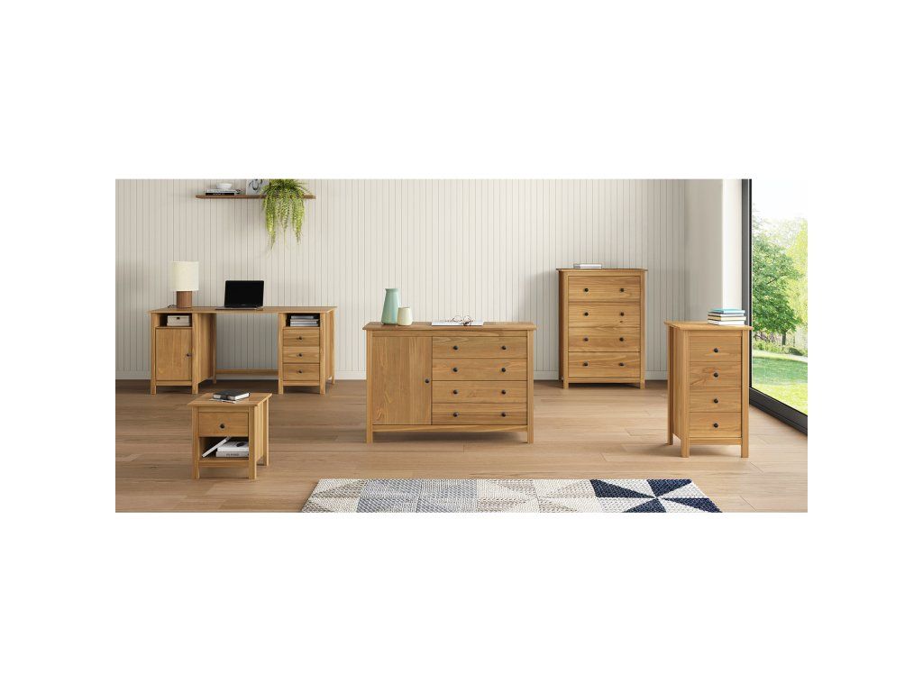 materiál masiv borovice voskovaná v medovém odstínu kovové úchytky v barevném provedení černěná mosaz 2 otevřené police, 1 dvířka a 3 zásuvky s kovovými pojezdyDoplňkové parametry