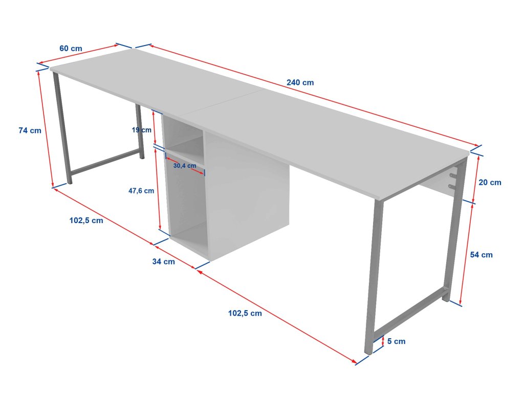 Tento stůl s rozměry 240 cm na šířku, 74 cm na výšku a 60 cm na hloubku poskytuje dostatek plochy pro všechny vaše studijní potřeby. Prostřední police má šířku 34 cm a výšku 50 cm, což je ideální pro uložení knih, sešitů a dalších nezbytností. Možnost upevnění stolu ke zdi navíc zvyšuje stabilitu a bezpečnost.