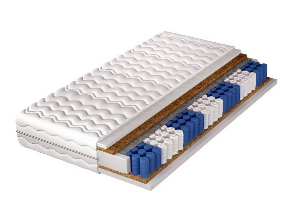 Pružinová matrace 160x200 cm v pratelném snímatelném potahu. Jádro matrace je charakteristické hustě uspořádanými taštičkovými pružinami v množství 262 ks/m2 a 7 zónami tvrdosti, které zajišťují dokonalou oporu těla a komfort odpočinku. Za zmínku stojí funkce taštičkových pružin, které pracují odděleně a reagují jen v místě tlaku. Pokud si tedy na matraci lehnete, dojde ke stlačení pouze těch pružin, na které se vyvíjí tlak. Matrace je z obou stran potažena 1 cm silnou kokosovou deskou a PUR pěnou T25 o síle 2 cm. Kokos se v matracích používá ke zpevnění, zvýšení nosnosti a odolnosti, zároveň je antibakteriální a antialergický. Pomáhá odvádět vlhkost z matrace a udržuje uvnitř suché prostředí. Matrace je hypoalergenní a použití bavlny v potahu matrace podporuje cirkulaci vzduchu a poskytuje dobrou tepelnou izolaci. Je odolná vůči různým druhům tlaku, deformaci a promáčknutí a poskytuje dobrou ventilaci, což ocení lidé s nadměrným pocením. Matrace má označení tvrdosti H5 - extra tvrdá. Výška matrace je +/- 20 cm. Barva pěn se může lišit od vyobrazení.