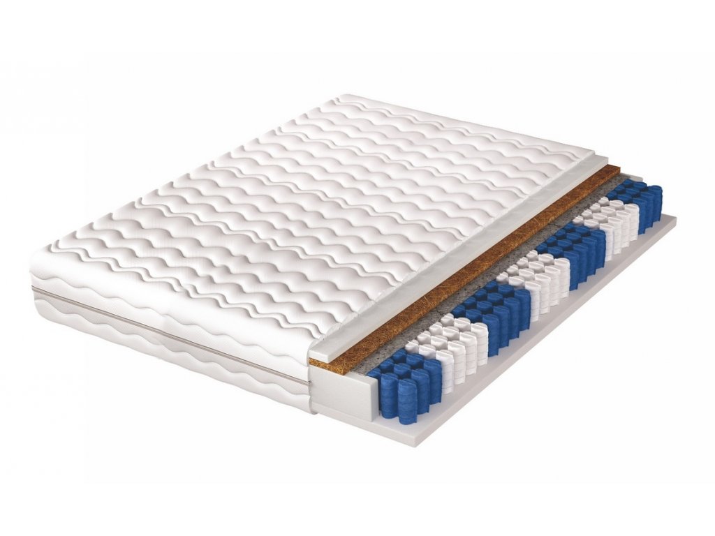 Pružinová matrace v pratelném snímatelném potahu. Jádro matrace je charakteristické hustě uspořádanými taštičkovými pružinami v množství 262 ks/m2 a 7 zónami tvrdosti, které zajišťují dokonalou oporu těla a komfort odpočinku. Za zmínku stojí funkce taštičkových pružin, které pracují odděleně a reagují jen v místě tlaku. Pokud si tedy na matraci lehnete, dojde ke stlačení pouze těch pružin, na které se vyvíjí tlak. Matrace je z jedné strany potažena 1 cm silnou kokosovou deskou a z obou stran PUR pěnou T25 o síle 2 cm. Kokos se v matracích používá ke zpevnění, zvýšení nosnosti a odolnosti, zároveň je antibakteriální a antialergický. Pomáhá odvádět vlhkost z matrace a udržuje uvnitř suché prostředí. Matrace je hypoalergenní a použití bavlny v potahu matrace podporuje cirkulaci vzduchu a poskytuje dobrou tepelnou izolaci. Je odolná vůči různým druhům tlaku, deformaci a promáčknutí a poskytuje dobrou ventilaci, což ocení lidé s nadměrným pocením. Matrace má označení tvrdosti H3/H5 - středně tvrdá/extra tvrdá. Výška matrace je +/- 19 cm. Barva pěn se může lišit od vyobrazení.Doplňkové parametry