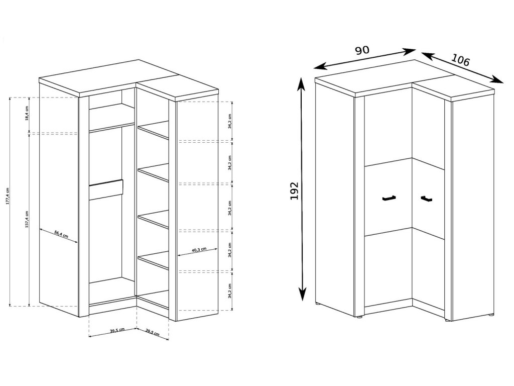 Rohová šatní skříň s rohem nalevo. Roh nalevo znamená, že napravo je volný prostor se šatní tyčí a vlevo jsou 4 police (podrobné rozměry viz perokresba). Možnost objednání i opačné verze. Systém je exkluzivní kolekce navržena v moderním duchu. Celá řada se vyznačuje elegancí a jednoduchými tvary, které zaručují plné využití prostoru. Nábytek je vyroben z kvalitního lamina s ABS hrany ( 0,5-0,8 mm ). Barevné provedení jasan světlý. Dodáváme v demontovaném stavu.Doplňkové parametry