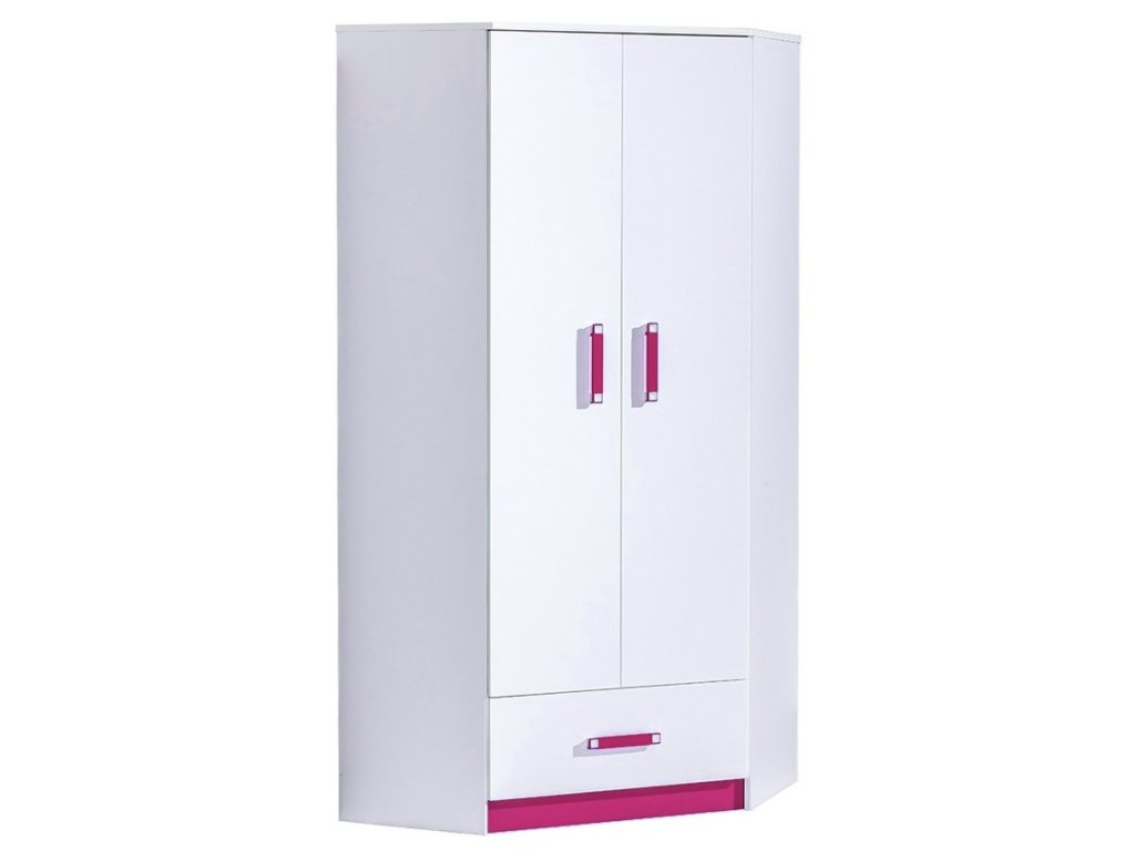 Rohová šatní skříň TRAFICO ze sektorové řady, která se vyznačuje netradičním zpracováním barev a originalitou úchytů. Tento styl nábytku zaujme každou mladší generaci. Skříň je vyrobena z kvalitní LTD desky hraněné ABS lištou. Korpus i dveře jsou v bílé matné barvě, doplňková barva je růžová. Úchytky jsou v barevné kombinaci růžová/bílá. Uvnitř skříně je šatníková tyč a 3 police, v dolní části je zásuvka. Sektorový nábytek TRAFICO má široký výběr prvků, který Vám zaručí sestavit si dětský nebo studentský pokoj, ložnici či kancelář podle svých potřeb, přání a představ. Dodáváme v demontovaném stavu.Doplňkové parametry