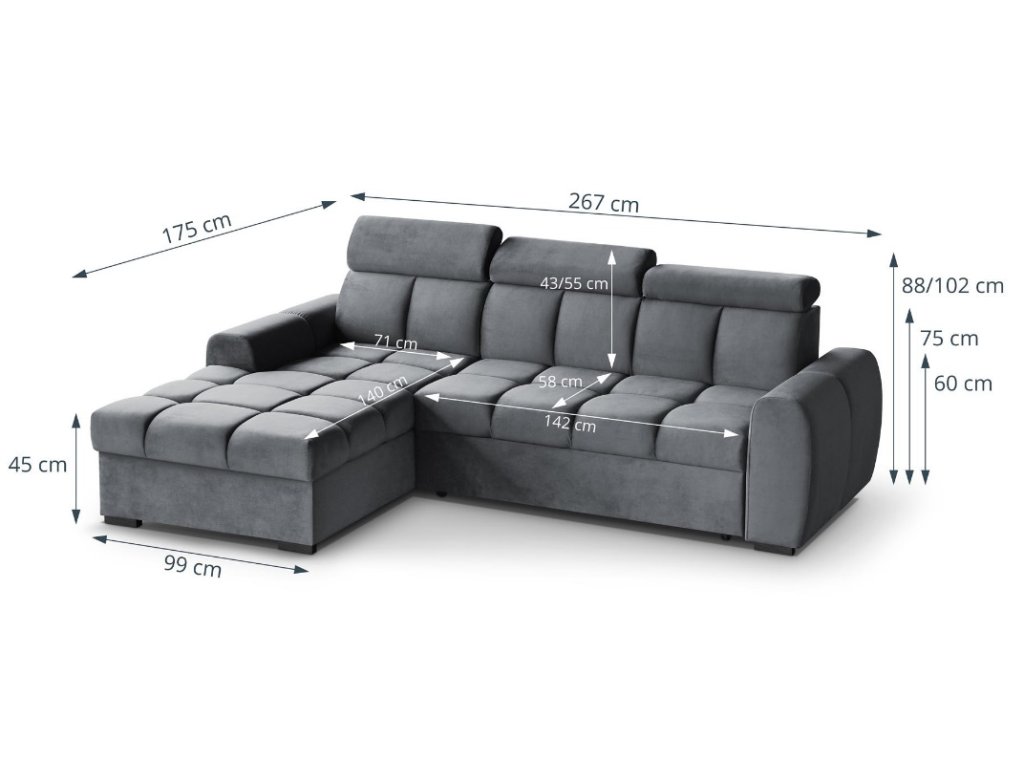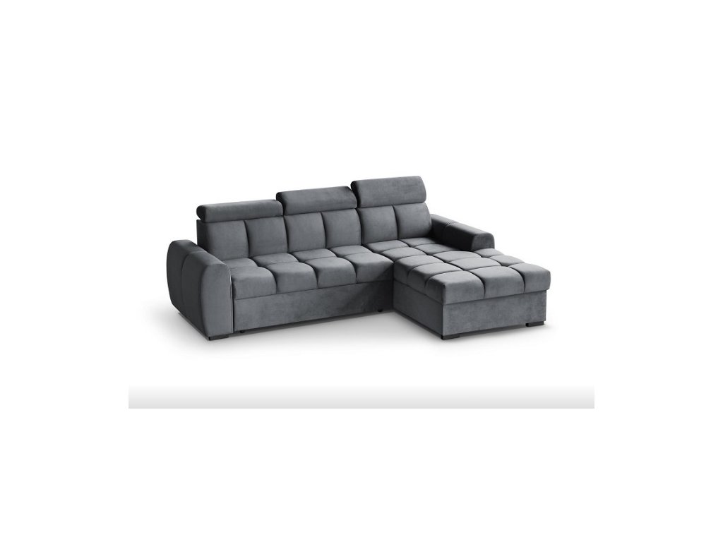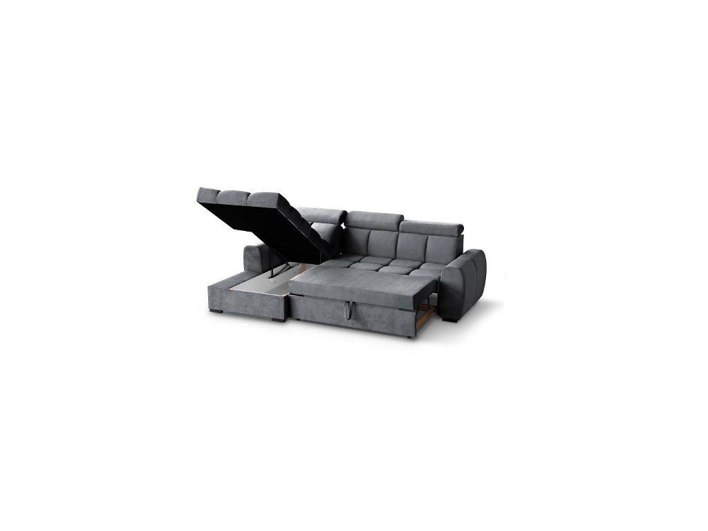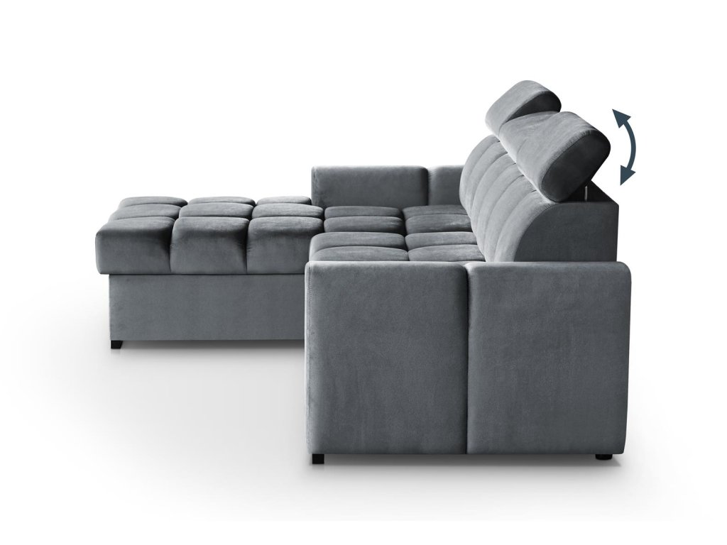 Elegantní a velice pohodlná rohová sedací souprava Gomez s polohovatelnými záhlavci. Nechte se hýčkat elegantní celočalouněnou sedací soupravou Gomez , kterou můžete umístit do prostoru. Sedací souprava snadno navodí pocit domácí pohody s nádechem luxusu. Svou velikostí poskytne komfortní sezení díky výraznému prošívanému sedáku . Sedací souprava je rozkládací s funkcí DELFIN a má velký úložný prostor. Sedací souprava je vyrobená v látce Bluvel.