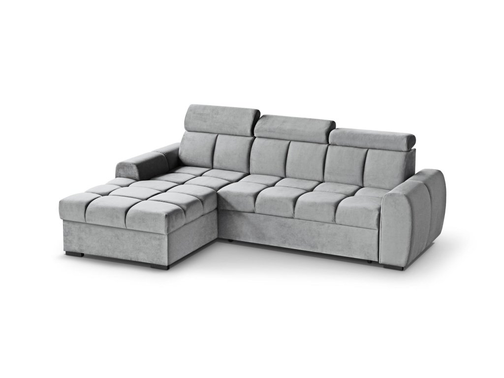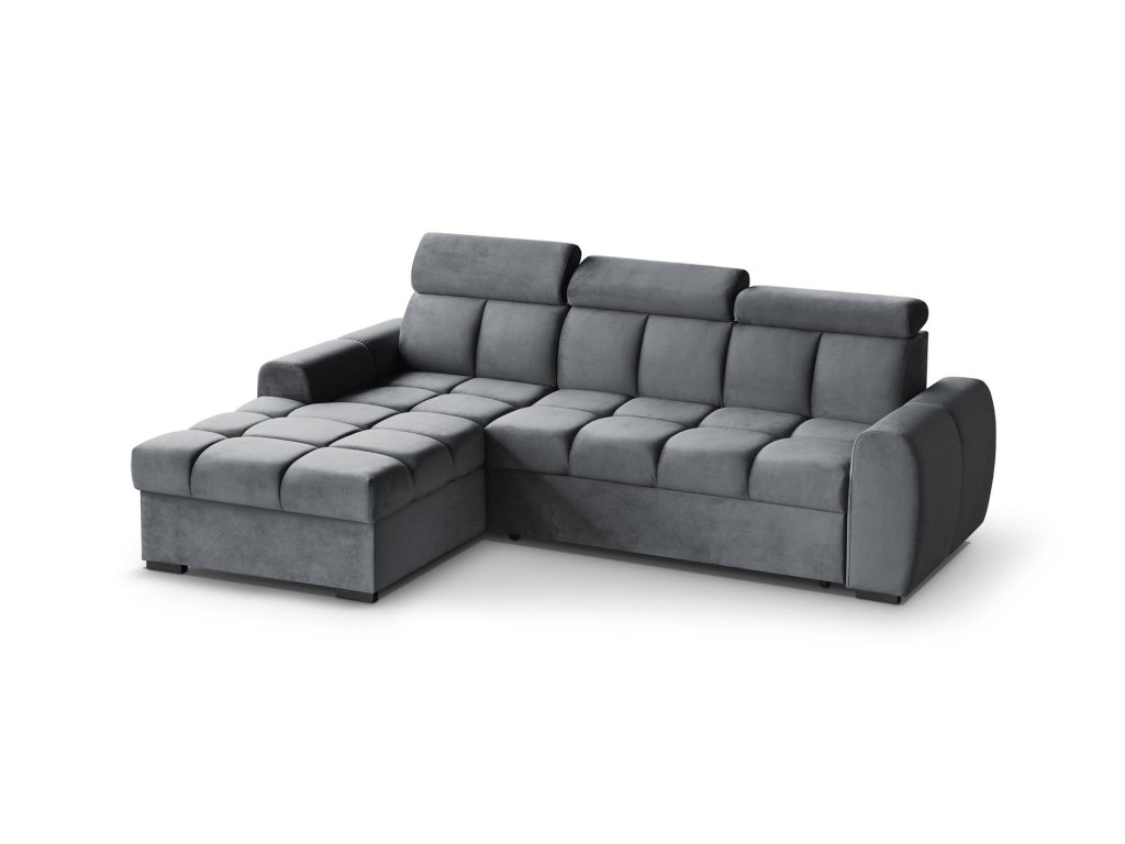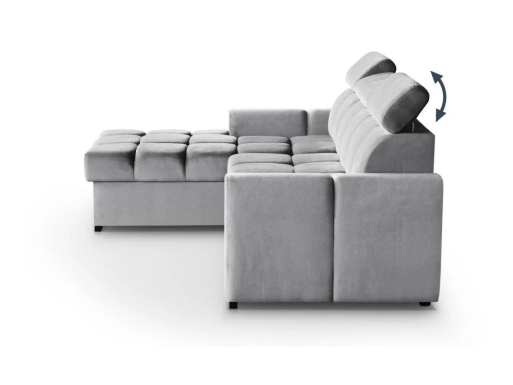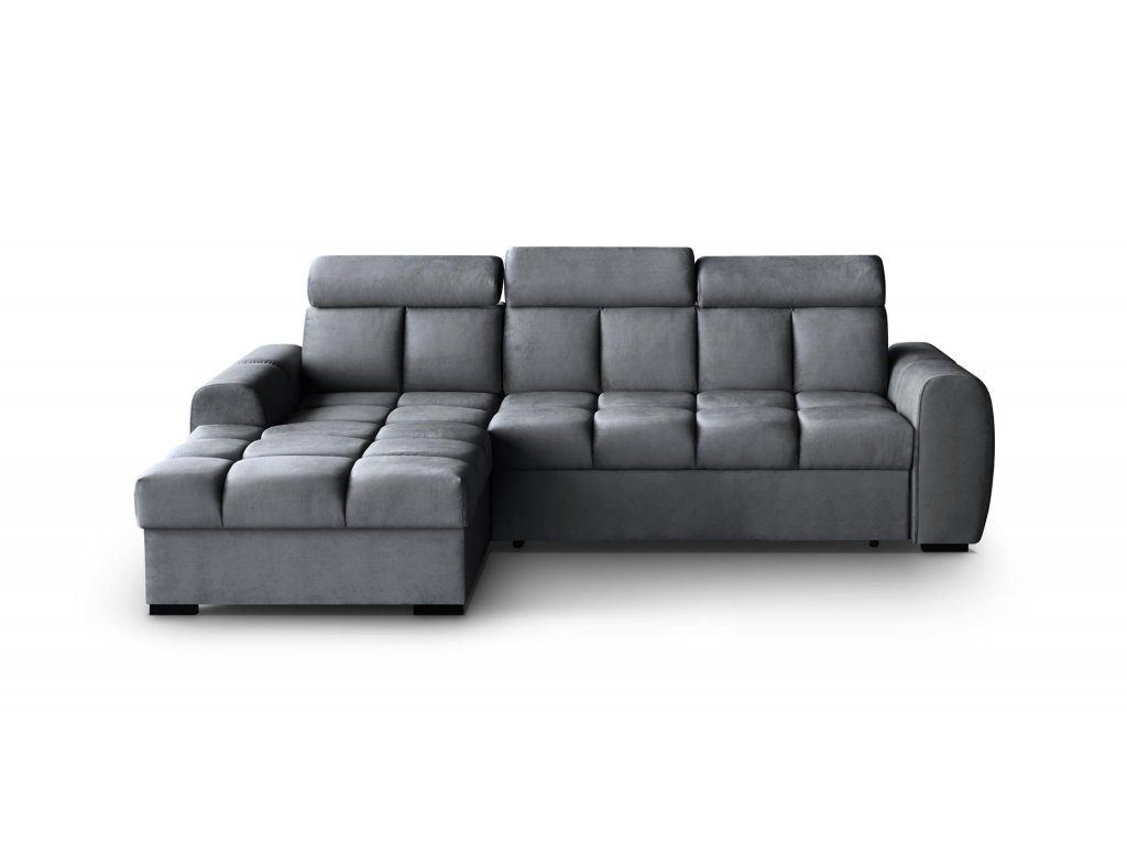 Elegantní a velice pohodlná rohová sedací souprava Gomez s polohovatelnými záhlavci. Nechte se hýčkat elegantní celočalouněnou sedací soupravou Gomez , kterou můžete umístit do prostoru. Sedací souprava snadno navodí pocit domácí pohody s nádechem luxusu. Svou velikostí poskytne komfortní sezení díky výraznému prošívanému sedáku . Sedací souprava je rozkládací s funkcí DELFIN a má velký úložný prostor. Sedací souprava je vyrobená v látce Bluvel.
