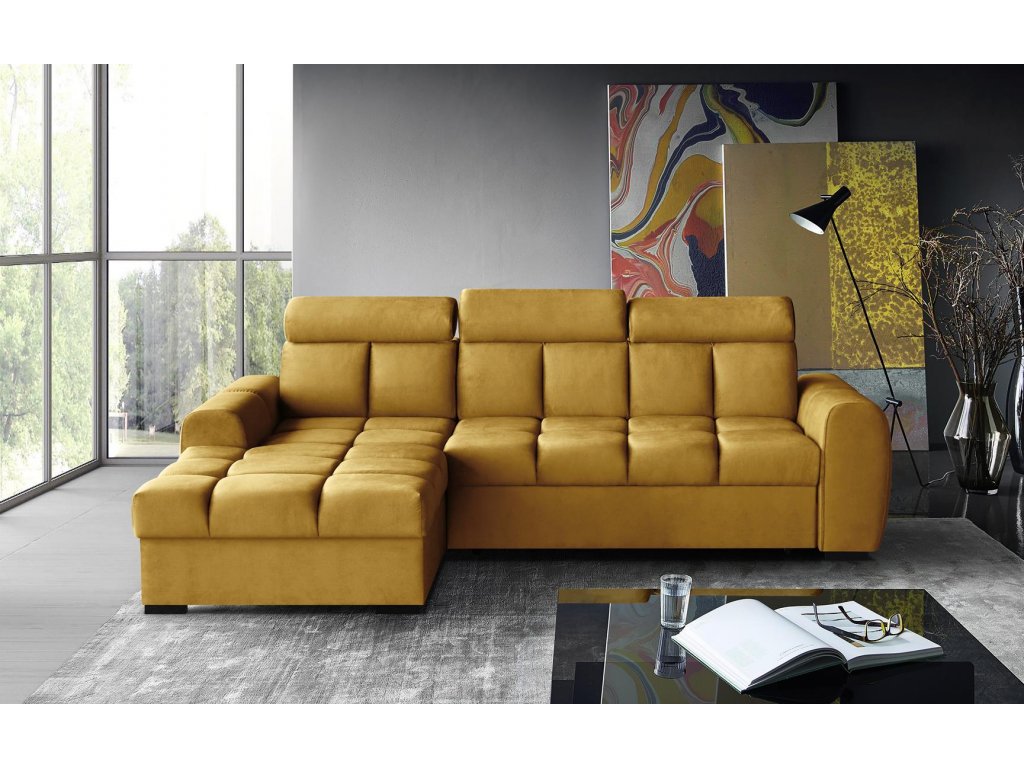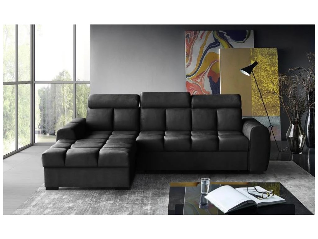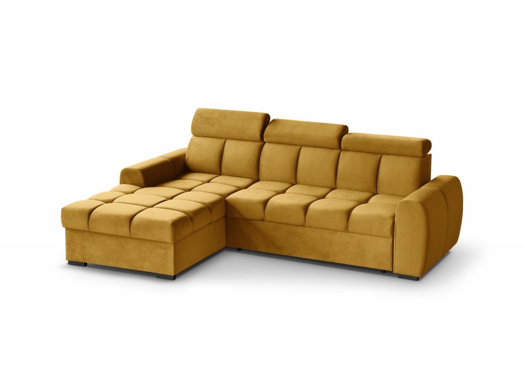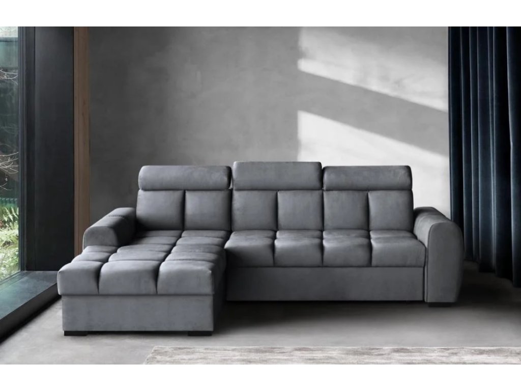 Elegantní a velice pohodlná rohová sedací souprava Gomez s polohovatelnými záhlavci. Nechte se hýčkat elegantní celočalouněnou sedací soupravou Gomez , kterou můžete umístit do prostoru. Sedací souprava snadno navodí pocit domácí pohody s nádechem luxusu. Svou velikostí poskytne komfortní sezení díky výraznému prošívanému sedáku . Sedací souprava je rozkládací s funkcí DELFIN a má velký úložný prostor. Sedací souprava je vyrobená v látce Bluvel.