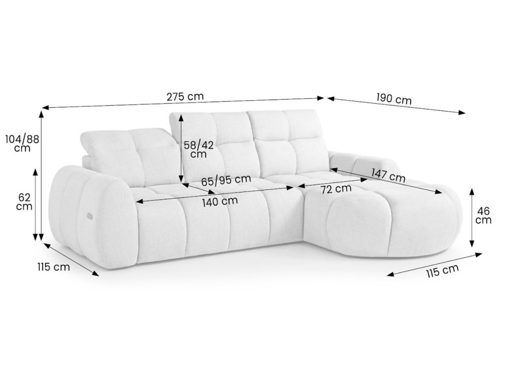 Moderní sedací souprava Sorena spojuje elegantní moderní design s maximálním pohodlím. Díky elektrickému systému prodloužení sedáku si snadno nastavíte hloubku sedu až na 95 cm, takže si užijete dokonalý relax při sezení i ležení. Souprava je vybavena nastavitelnými opěrkami hlavy pro individuální komfort každého uživatele. Kvalitní konstrukce s vlnitou pružinou zajišťuje dlouhou životnost a pohodlné sezení. Čalouněná opěrka zad umožňuje umístění sedačky i do prostoru. Elegantní vzhled podtrhuje dekorativní prošívání, které dodává sedací soupravě luxusní a nadčasový charakter.