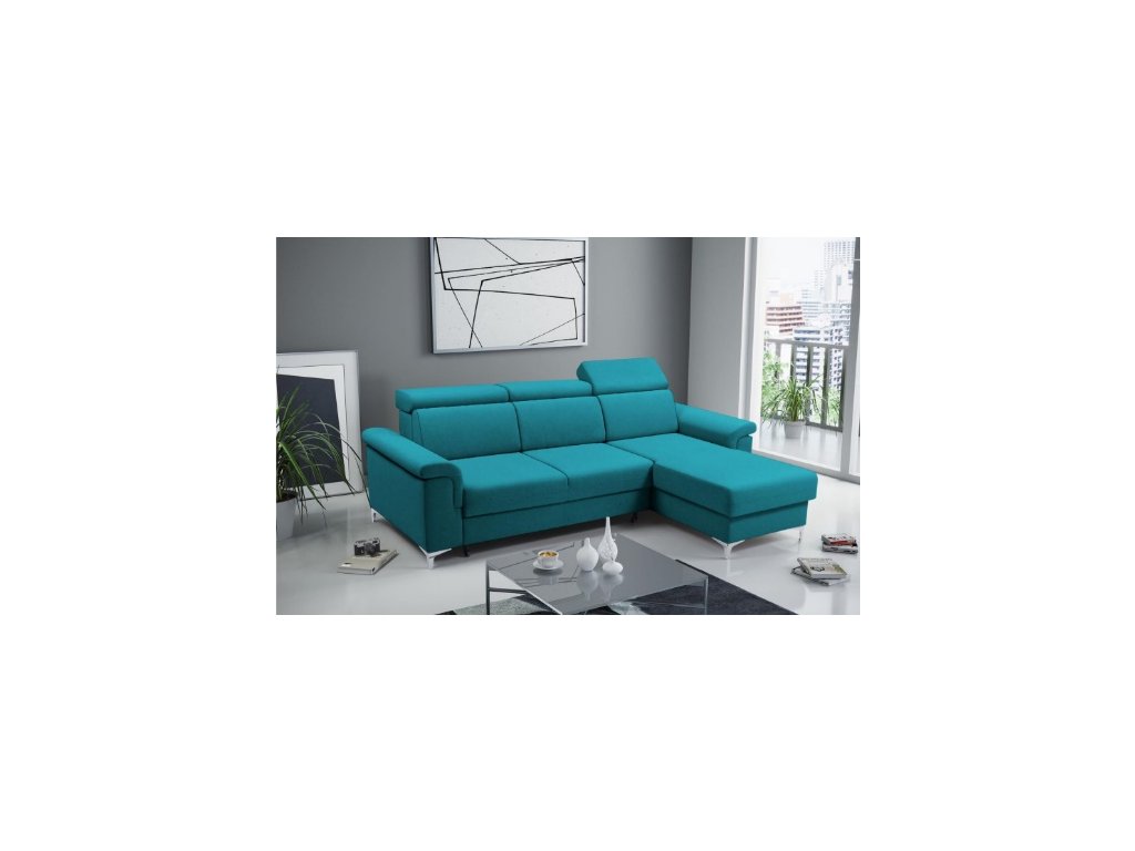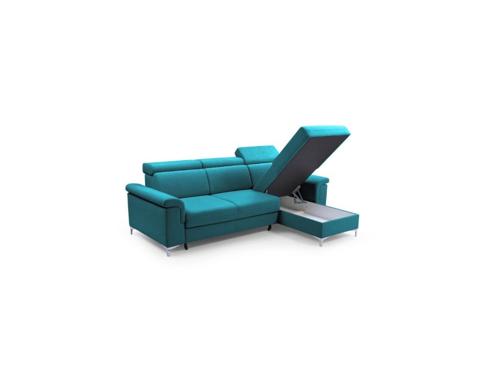Pohodlná rohová sedací souprava Vermont s nastavitelné opěrky hlavy se vyznačuje dobrým designem. Díky svým rozměrům je ideální do menších obývacích pokojů. Sedací souprava je rozkládací s DL mechanismem a úložným prostorem s čalouněnými zády. Vermont má chromované nohy, které vypadají skvěle s vybranými látkami a dodávají celku eleganci a šik. Sedací souprava je čalouněná v látce BLUVEL.