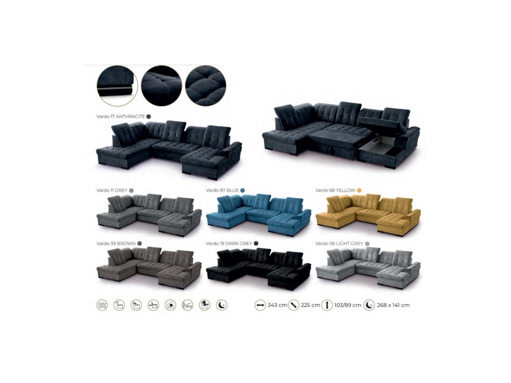 Velmi luxusní pohodlná sedací souprava Kair II New, která vyniká kvalitou a péčí o nejmenší detaily. Její předností je hluboký sedák s výsuvnými opěrkami zad s polohovatelnými záhlavci ,které zaručují pohodlí. Sedačka má úložný prostor a po rozkladu dostaneme velkou lehací plochu. Sedačka je celočalouněná v látce Vardo.