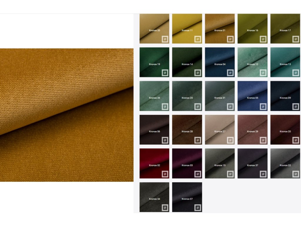 Kronos – je odolná sametová látka, která se snadno čistí a je vhodná pro domácí mazlíčky. Při doteku jsou na látce vidět různé odstíny barev.