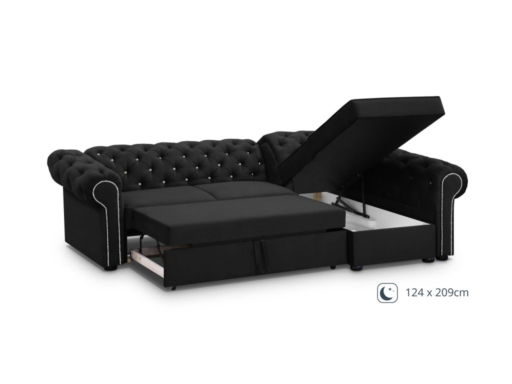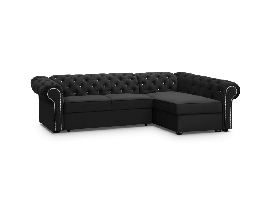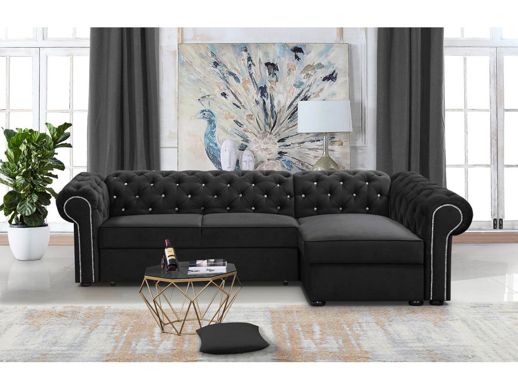 Sedací souprava Valentino s typickým prošíváním pro styl Chesterfield - je rozkládací a s úložným prostorem.