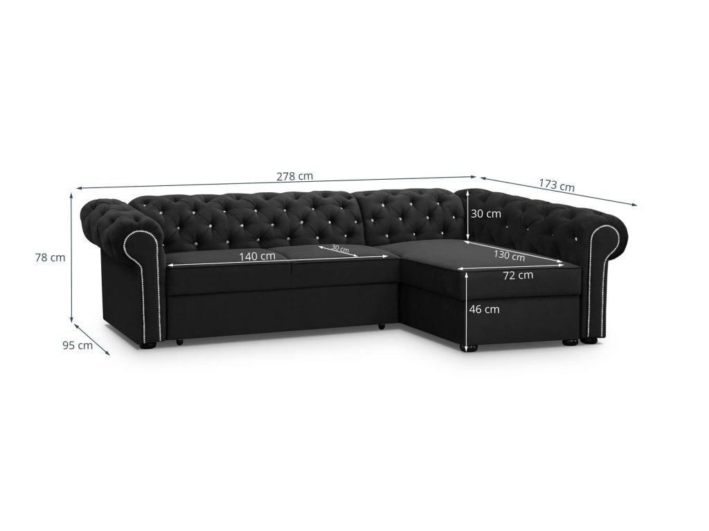 Sedačka má rozměry 278 x 173 x 78 cm, plocha spací 124 x 209 cm