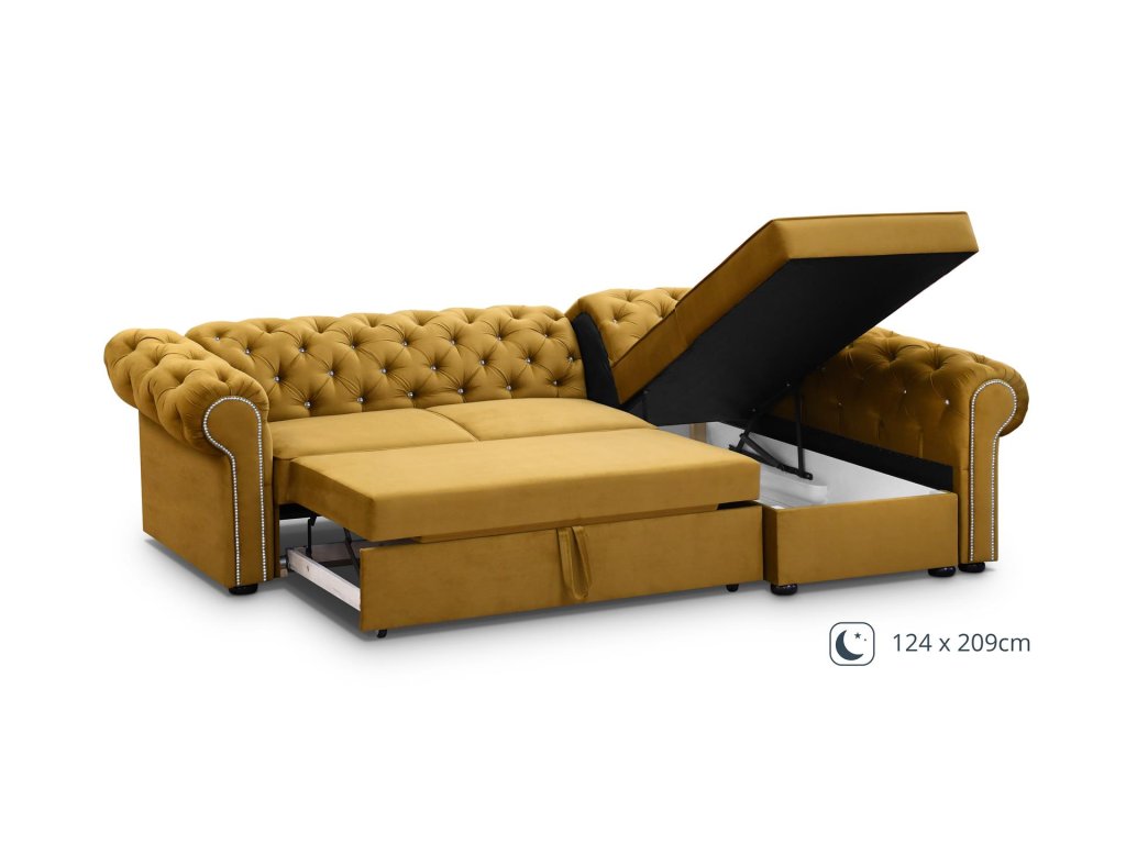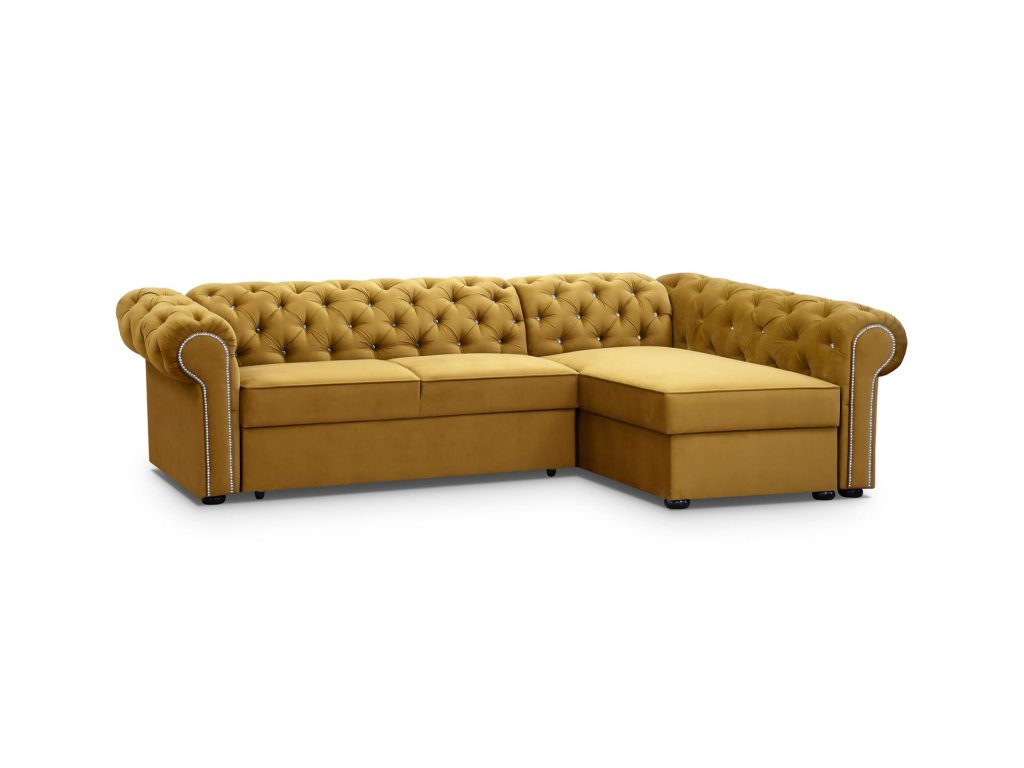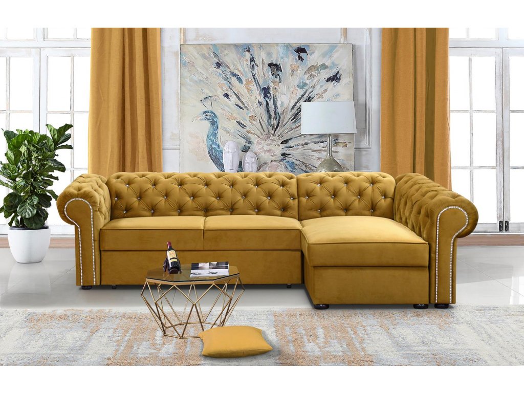 Sedací souprava Valentino s typickým prošíváním pro styl Chesterfield - je rozkládací a s úložným prostorem.