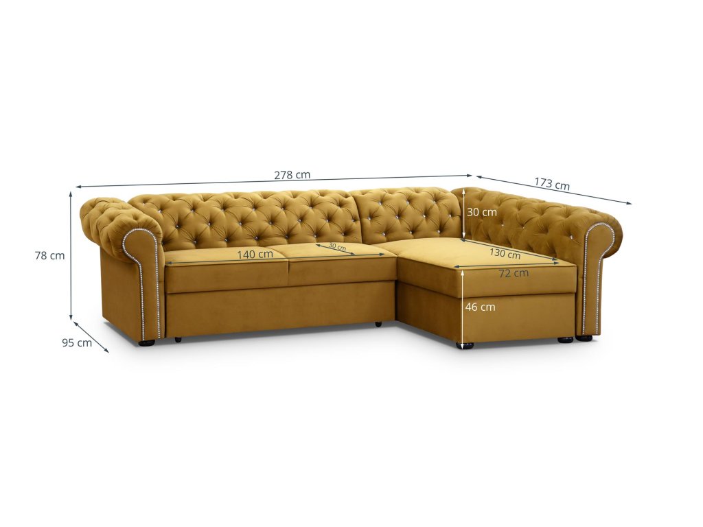 Sedačka má rozměry 278 x 173 x 78 cm, plocha spací 124 x 209 cm