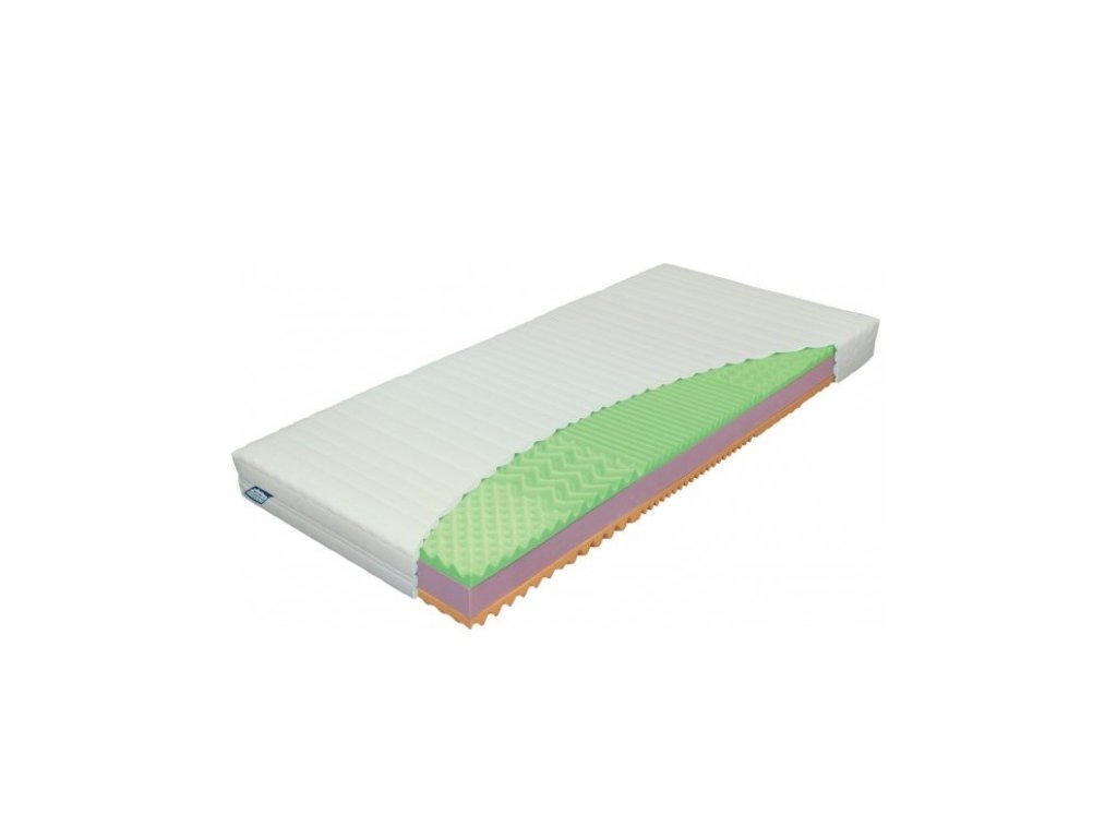 potah STANDARD prošitý s PES vláknem – gramáž 100 g/m2; vrchní profil: značková pěna ELIOCELL o hustotě 28 kg/m3; jádro matrace: značková pěna ELIOCELL o hustotě 25 kg/m3; spodní profil: značková pěna ELIOCELL o hustotě 25 kg/m3; FYZIOSYSTÉM – 5 zón rozložení hmotnosti