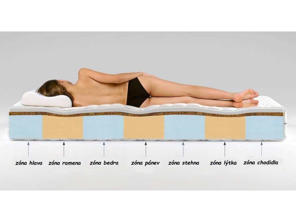 Pěnová matrace 140x200 cm v pratelném snímatelném potahu. Skládá se ze tří vrstev - střed tvoří sedmizónová profilovaná PUR pěna T25, která je z jedné strany obložena kokosovou deskou 1cm a PUR pěnou T25 tloušťky 2cm, z druhé strany jen je PUR pěna T25 v tloušťce 2 cm. Kokos se v matracích používá ke zpevnění, zvýšení nosnosti a odolnosti, zároveň je antibakteriální a antialergický. Pomáhá odvádět vlhkost z matrace a udržuje uvnitř suché prostředí. Matrace má tak 7 anatomických, optimálně rozložených zón, čímž se lépe přizpůsobí tvaru těla. 1. Zóna hlava: zlepšuje krevní oběh a zabraňuje bolestem hlavy 2. Zóna ramena: uvolňuje zádové svalstvo 3. Zóna bedra: zajišťuje správné držení těla při spánku 4. Zóna pánev: umožňuje udržet pánev v přímce 5. Zóna stehna: napomáhá uvolnění stehenních svalů 6. Zóna lýtka: podporuje ideální oběh krve 7. Zóna chodidla: zajišťuje odpočinek nohou bez nadměrného tlaku na paty. Matrace je hypoalergenní a použití bavlny v potahu matrace podporuje cirkulaci vzduchu a poskytuje dobrou tepelnou izolaci. Je odolná vůči různým druhům tlaku, deformaci a promáčknutí a poskytuje dobrou ventilaci, což ocení lidé s nadměrným pocením. Matrace má označení tvrdosti H3/H5 - středně tvrdá/extra tvrdá. Výška matrace je +/- 17 cm. Barva pěn se může lišit od vyobrazení.Doplňkové parametry