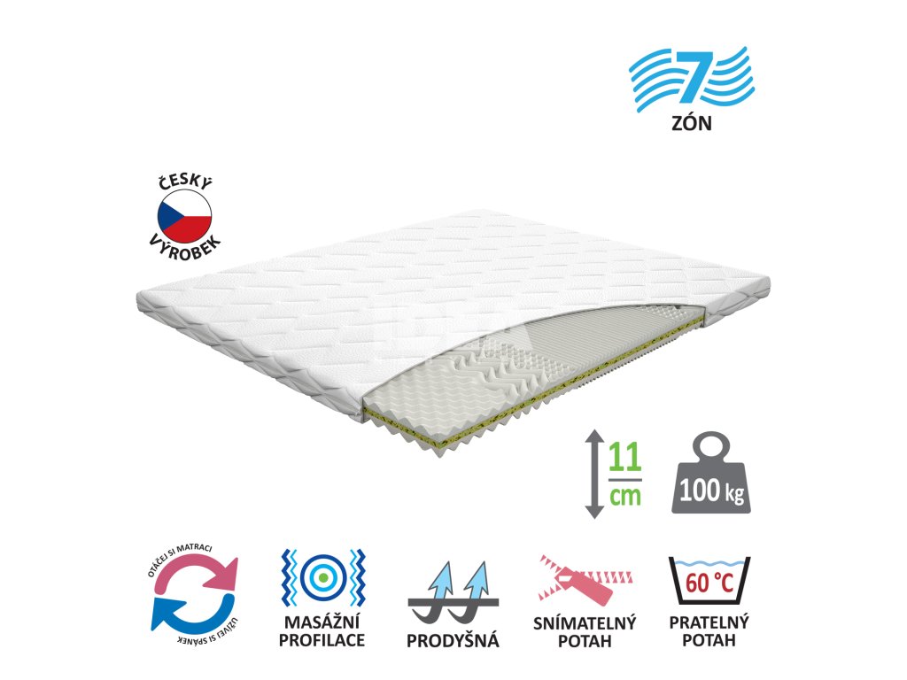 oboustranná sendvičová matrace, ložné plochy z kvalitních polyuretanových pěn obě strany – 7zónová anatomická profilace, která umožňuje provzdušnění lůžka a napomáhá uvolnění svalstva střední část z pojeného polyuretanu matrace střední tuhosti (3 z 5) doporučené uložení na pevný i polohovací lamelový rošt potah snímatelný a pratelný do 60 °C doporučená nosnost do 100 kg, výška matrace 11 cm, výška jádra 10 cmDoplňkové parametry