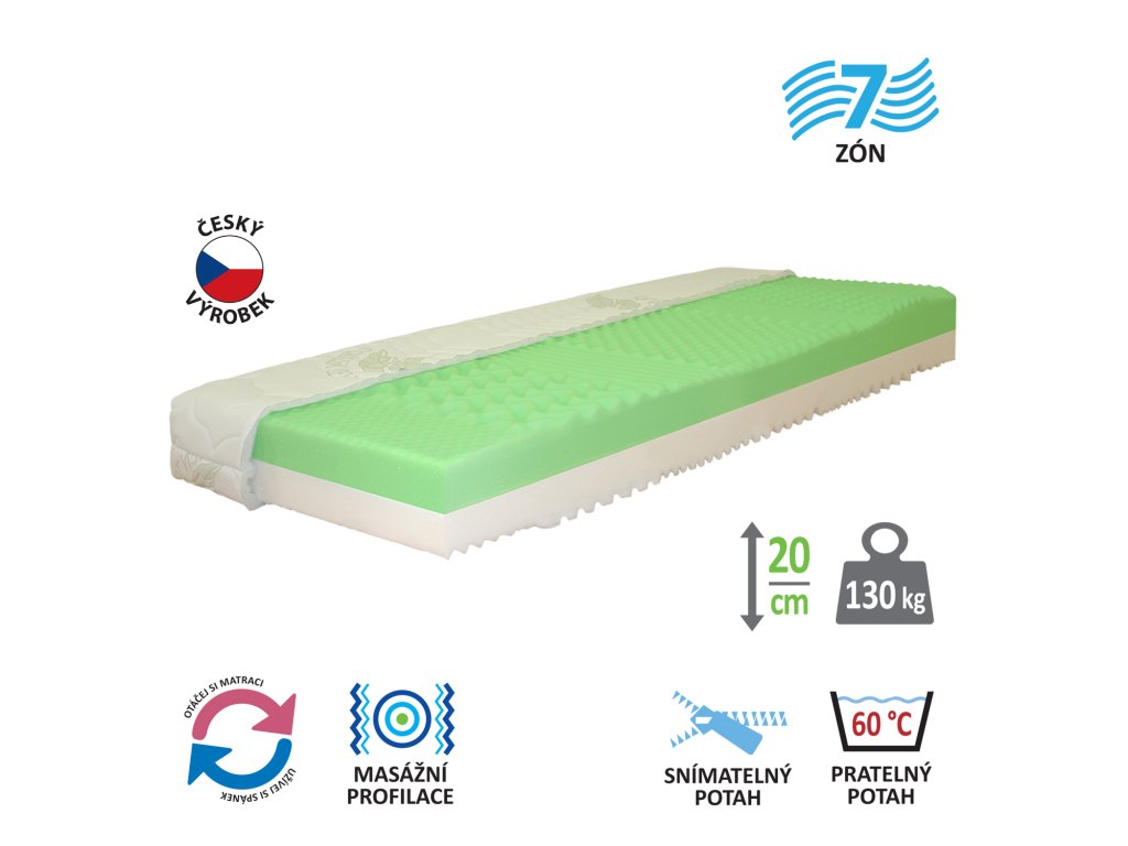masážní profily s různou pevností stran, jádro z Flexifoam pěny povrch vyprofilován do 7 anatomických zón na obou stranách tvrdá (bílá) a měkká (světle zelená) strana vhodná pro všechny typy roštů vhodná pro alergiky, potah snímatelný a pratelný do 60 °C doporučená nosnost do 130 kgDoplňkové parametry
