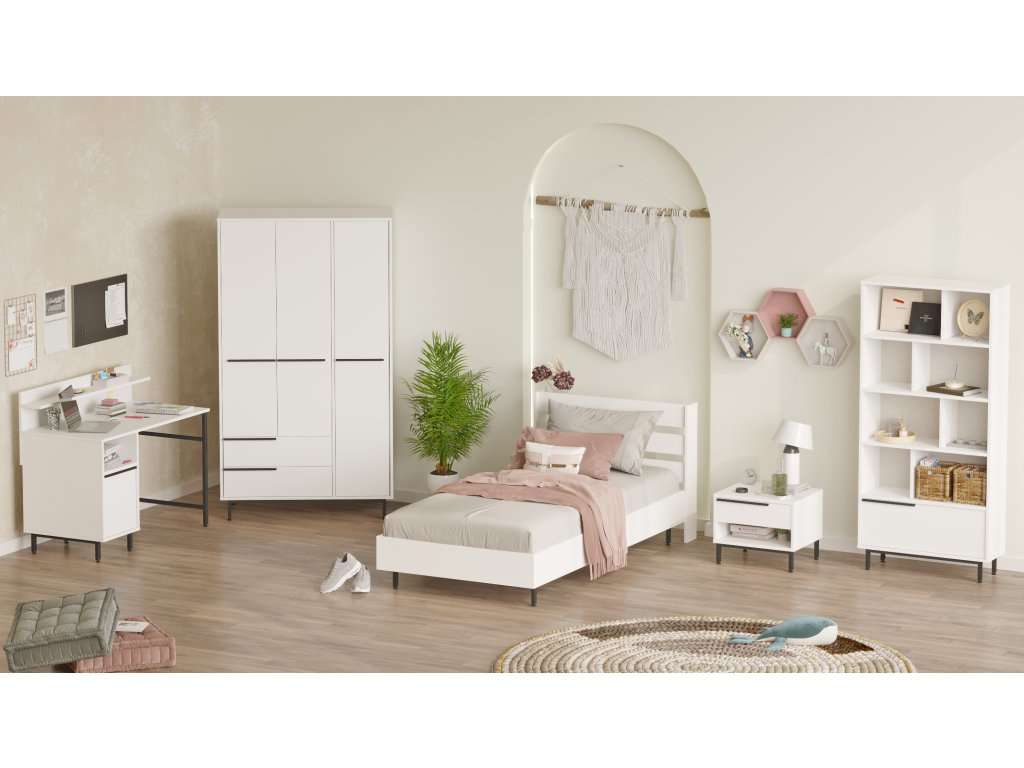 LONNY 24 kombinuje pohodlí a praktičnost. Postel poskytuje komfortní místo pro spánek, noční stolek je ideální pro lampičku nebo knihy, šatní skříň nabízí dostatek úložného prostoru pro oblečení a psací stůl zajišťuje ideální pracovní prostor pro studium nebo tvoření. Díky promyšlenému designu je tato sestava skvělým řešením pro organizovaný a stylový dětský pokoj.