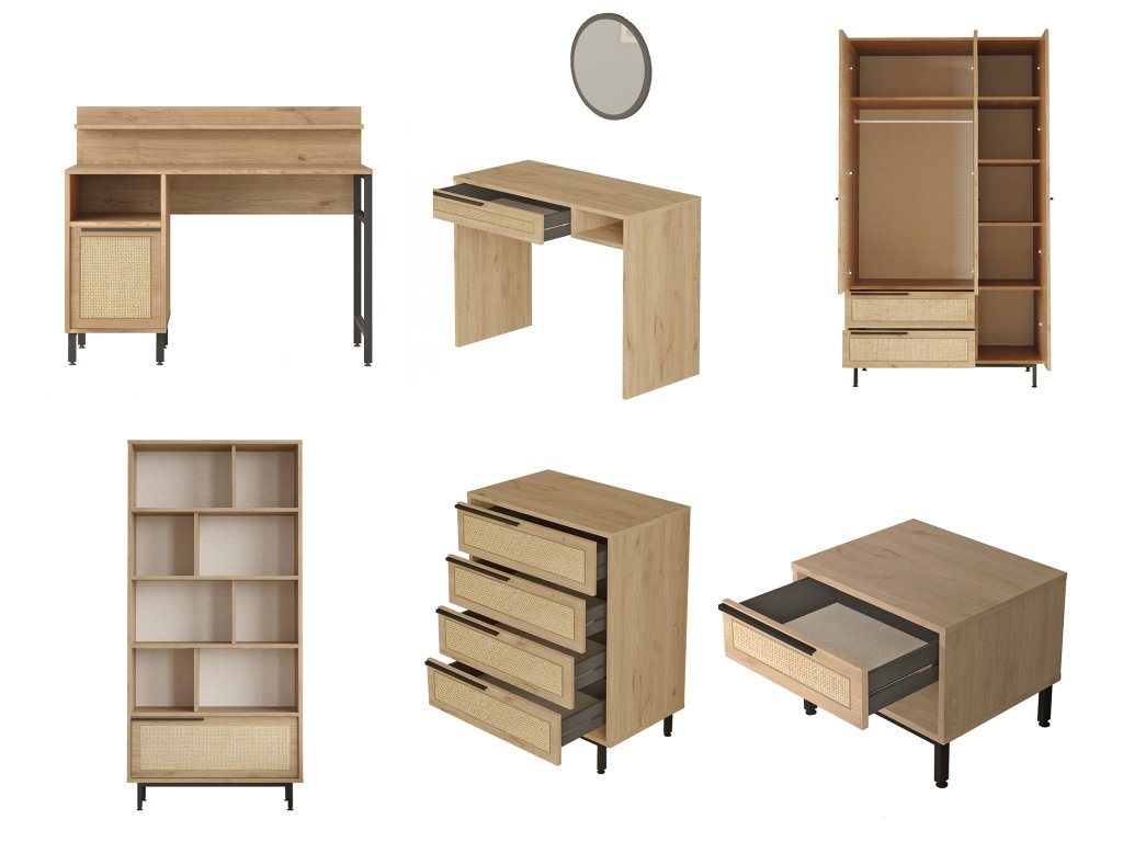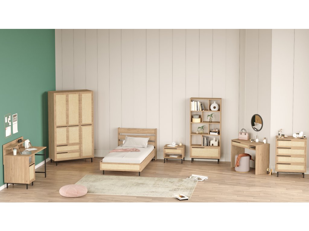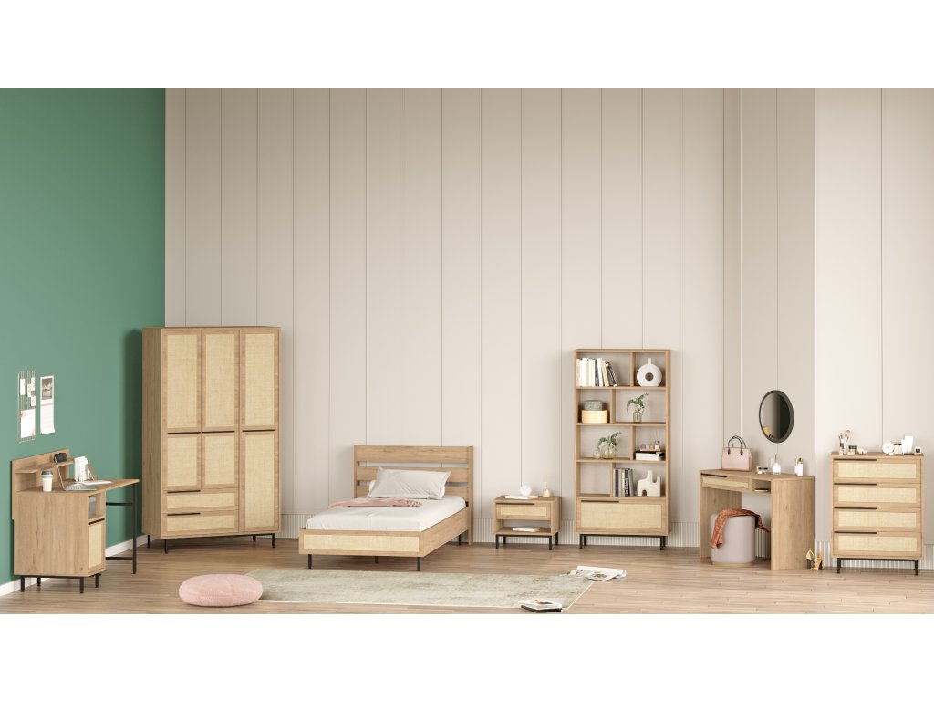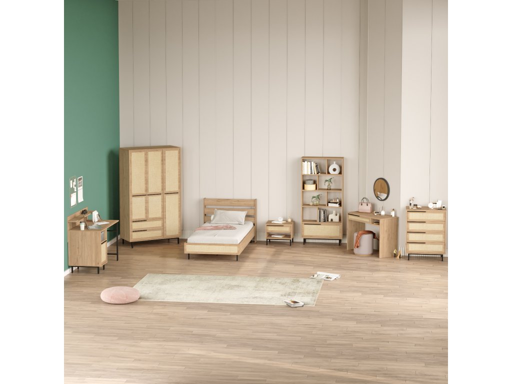 kombinuje pohodlí, praktičnost a styl. Postel nabízí komfortní místo pro spánek, noční stolek poskytuje prostor pro lampičku a knihy, šatní skříň zajistí dokonalou organizaci oblečení, psací stůl vytvoří ideální prostředí pro učení, knihovna nabídne prostor pro knihy a dekorace, a toaletní stolek dodává pokoji elegantní a praktický prvek pro osobní péči.