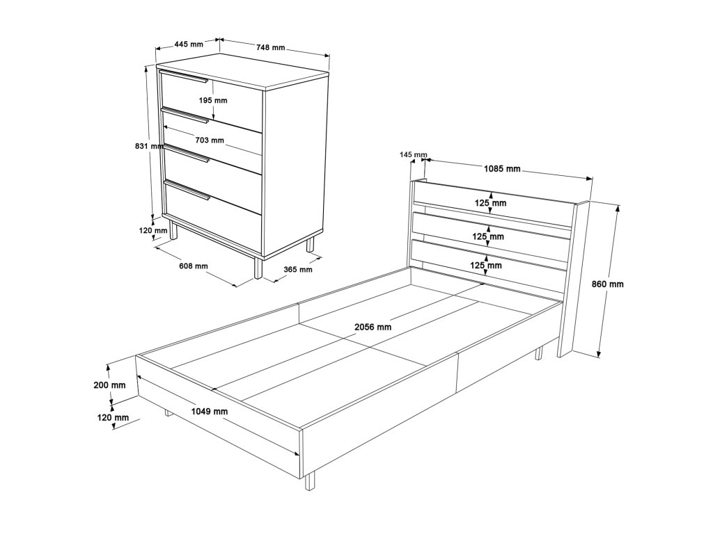 - Jednolůžková postel: 205,6 x 108,5 x 86 cm