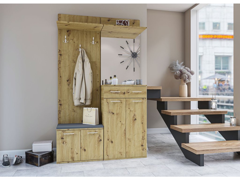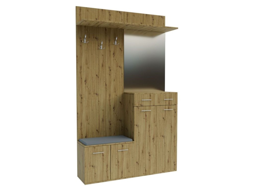Předsíňová stěna vyrobená z kvalitní laminátové desky ( zadní panel HDF ) v barevném provedení dub artisan. Sestava se skládá ( š/v/h ) - panel s věšákem a komodou ( 60 x 200 x 30 cm ) a panel se zrcadlem a botníkem se zásuvkou ( 60 x 200 x 30 ). Další rozměry viz perokresba. Sedací polštářek je v ceně (barevné provedení polštářku se od obrázku může lišit). Dodáváme v demontovaném stavu.Doplňkové parametry