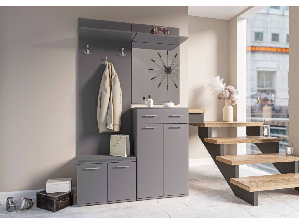 Předsíňová stěna vyrobená z kvalitní laminátové desky ( zadní panel HDF ) v barevném provedení grafit šedý. Sestava se skládá ( š/v/h ) - panel s věšákem a komodou ( 60 x 200 x 30 cm ) a panel se zrcadlem a botníkem se zásuvkou ( 60 x 200 x 30 ). Další rozměry viz perokresba. Sedací polštářek je v ceně (barevné provedení polštářku se od obrázku může lišit). Dodáváme v demontovaném stavu.Doplňkové parametry