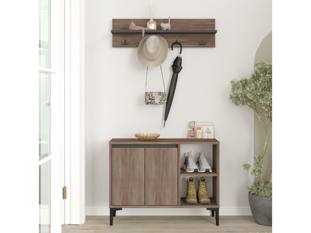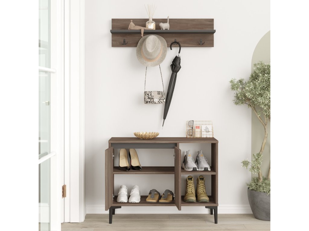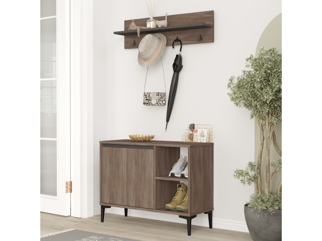 Vyrobená z kvalitního LTD materiálu o tloušťce 18 mm, tato sestava spojuje teplý odstín ořechu se stylovou šedou. Loftový industriální styl dodá vašemu vstupu na osobitosti a zároveň zajistí praktické uskladnění vašich věcí.