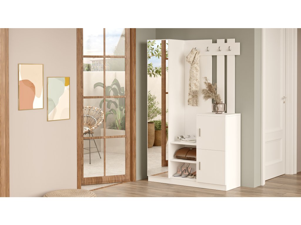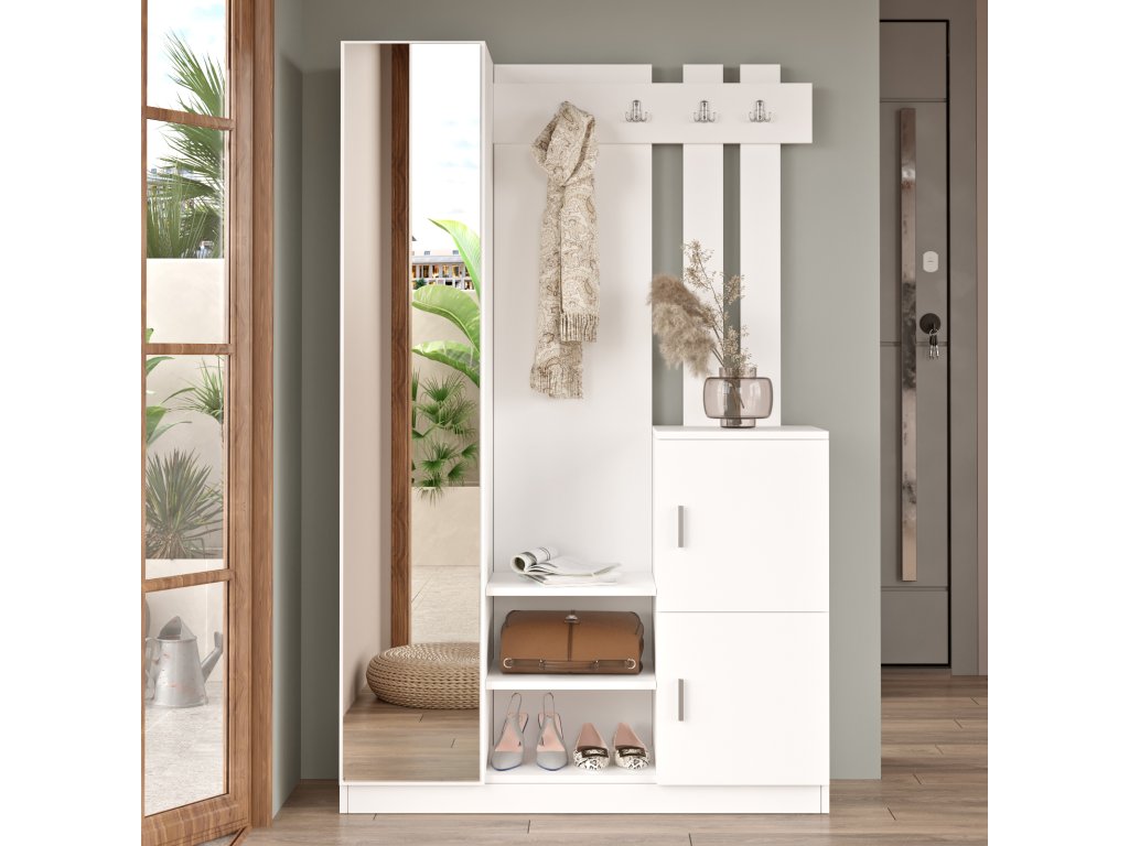 kombinuje styl a funkčnost. Věšáková stěna se skříňkou poskytuje prostor pro zavěšení kabátů, tašek nebo deštníků, zatímco policová skříň se zrcadlem umožňuje uložit boty, doplňky nebo jiné nezbytnosti. Zrcadlo navíc opticky zvětšuje prostor a přináší do předsíně více světla. Díky bílému provedení vynikne sestava v každém interiéru.