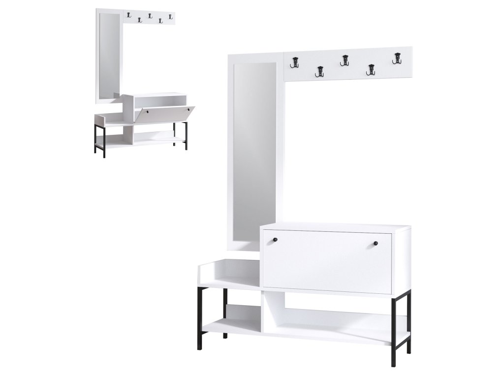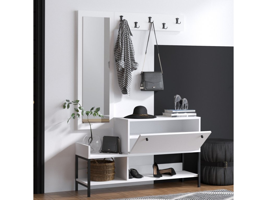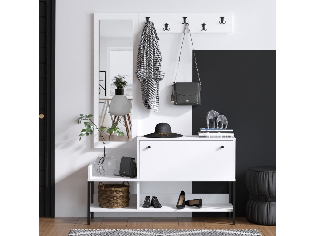 Naše skříňka na boty, vyrobená s maximální péčí, je vyrobena ze 100% dřevotřísky s melaminovým povlakem, což zaručuje odolnost a dlouhou životnost. Její elegantní design a moderní barevná kombinace bílé a černé z ní činí stylový doplněk každé místnosti. Díky dostatku úložného prostoru se konečně můžete rozloučit s přeplněnými chodbami a hromadami bot.