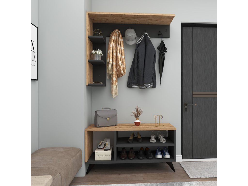 Předsíňová sestava kombinuje moderní design a praktické uspořádání, které pomůže udržet předsíň přehlednou a stylovou. Tato sestava zahrnuje skříňku na boty a horní polici s věšáky, což poskytuje dostatek prostoru pro uložení obuvi, kabátů a dalších doplňků.