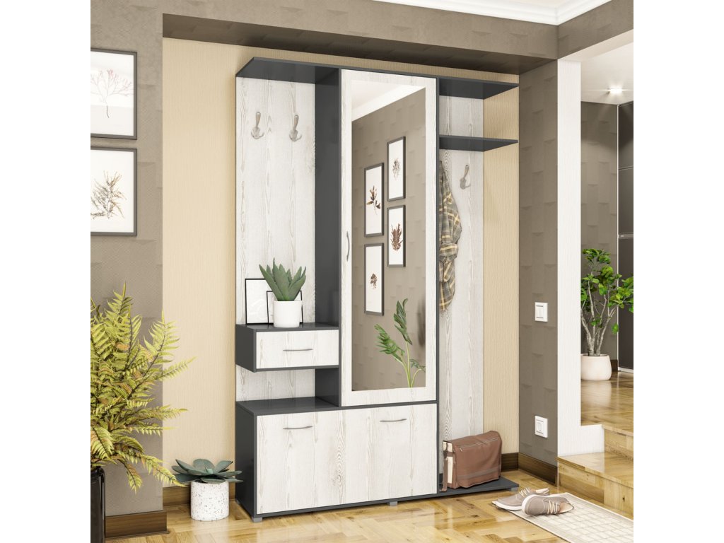 O stylový design Vaší vstupní části se postará moderní předsíňová sestava . Kombinace moderních barev jako light Artwood v kombinaci s barvou antracit jí dodává jedinečný charakter. Za praktický rozměr sestavy jsou zodpovědné úložné prostory v podobě výklopné skříňky na boty, úzké skříně se šatní tyčí uvnitř a také zásuvky na drobnosti. Snadný přístup ke kabátům zajišťují četné věšáky, které jsou připevněny k zadnímu panelu panelu.
