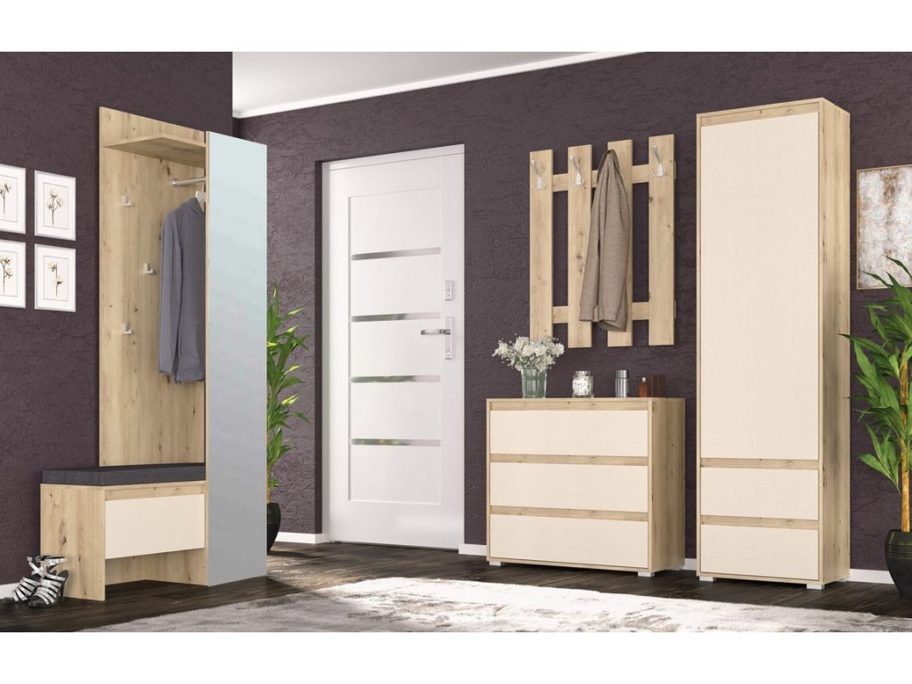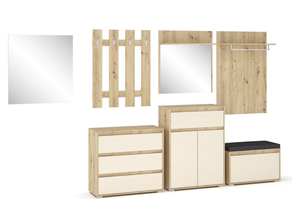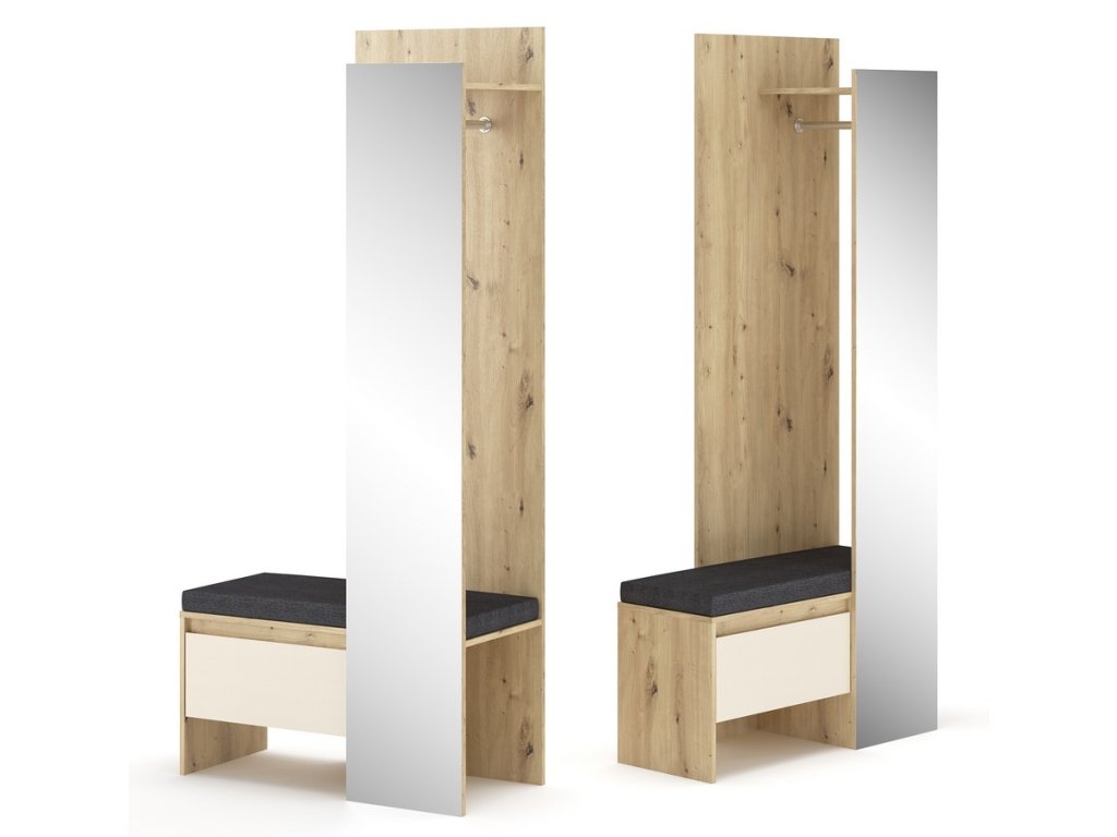 Moderní předsíňová stěna je vyrobena z kvalitní laminátové desky v barevné kombinaci dub artisan/champagne. Součástí stěny je botník se zásuvkou, věšáková stěna s policí a šatní tyčí, která je připevněna k zrcadlu. Polštářek není součástí botníku, nelze doobjednat. Dodáváme v demontovaném stavu.Doplňkové parametry