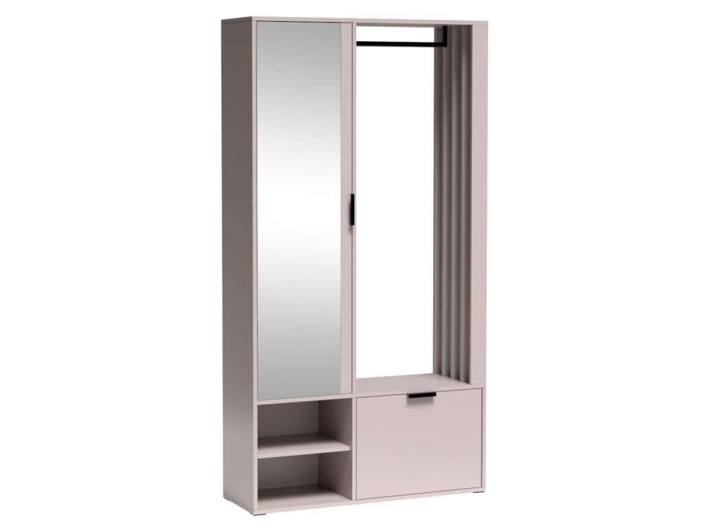 Moderní předsíňová stěna, vyrobená z kvalitní laminátové desky 16 mm v barvě kašmír (béžová s růžovým nádechem). Boční strana předsíně je tvořena z lamel. Sestava se skládá z věšákového panelu, botníku a skříně se zrcadlem a volným prostorem. Rozměry viz obrázek. Předsíň je univerzální, dá se složit na obě strany. Dodáváme v demontovaném stavu.