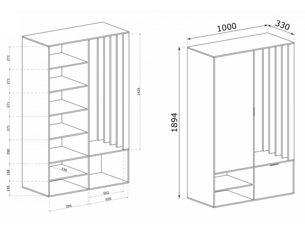 Moderní předsíňová stěna, vyrobená z kvalitní laminátové desky 16 mm v barvě světlý grafit (šedý). Boční strana předsíně je tvořena z lamel. Sestava se skládá z věšákového panelu, botníku a skříně se zrcadlem a volným prostorem. Rozměry viz obrázek. Předsíň je univerzální, dá se složit na obě strany. Dodáváme v demontovaném stavu.
